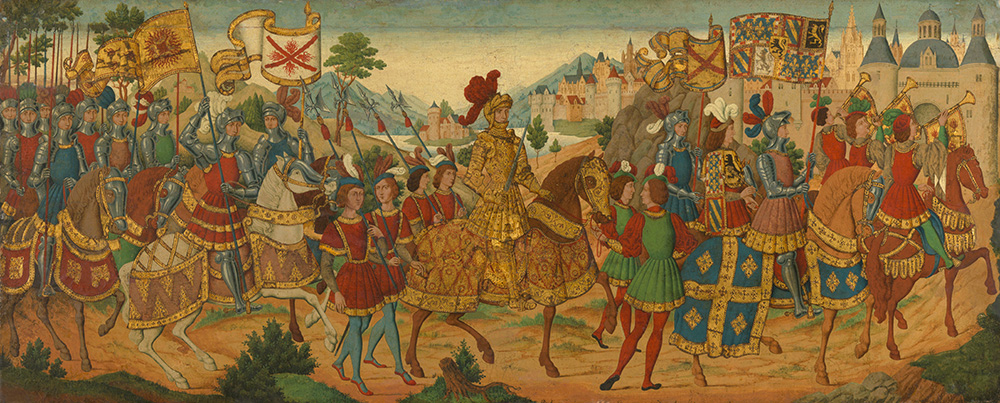 This panel takes us back to November 30, 1475 — the day Duke Charles the Bold entered the city of Nancy in full splendor. It was the feast day of Saint Andrew, the patron saint of Burgundy, and everything about this procession exuded power and ceremonial authority. The duke appears on horseback in dazzling armor, surrounded by nobles, pages, and heralds who embody the wealth and grandeur of his court. At the front march trumpeters and standard-bearers, their flags decorated with blazing suns, crosses, and firesteels — proud symbols of the Order of the Golden Fleece and of the various regions united under the Burgundian realm.