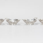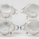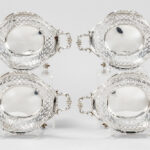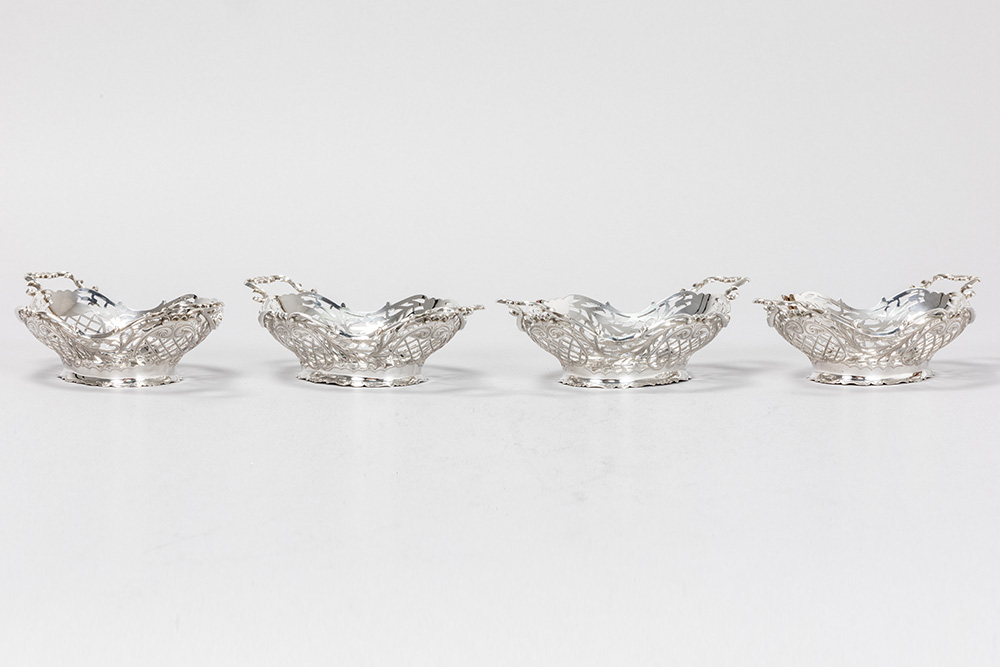 HOEKER & ZOON (Amsterdam) set van vier Nederlandse mandjes met grepen en geajoureerde opstand in massief zilver, gemerkt “2de gehalte” – breedte : 18,7 cm – gewicht : 430 gram getekend