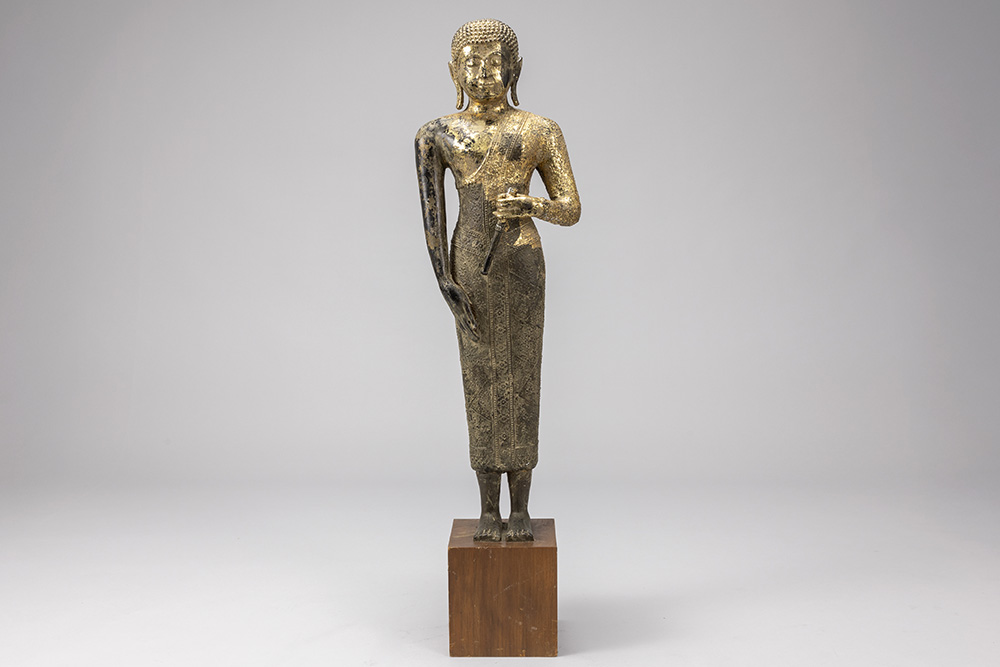 antique Siamese Ayutthaya period “Standing Monk” sculpture in gilded bronze