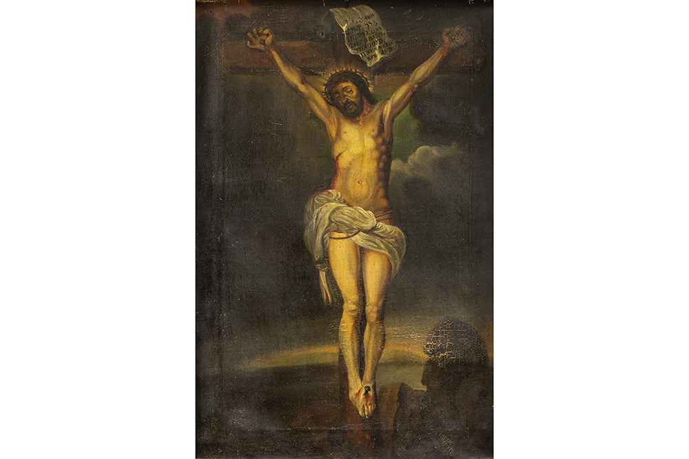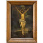 Antieke volkskunst : olieverfschilderij op doek met een gekruisigde Christus – 42 x 28