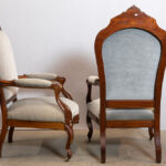 Paar negentiende eeuwse Napoleon III-armstoelen in acajou met gesculpteerde Lodewijk XV-ornamentiek – 121 x 67 x 61 cm
