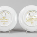 Paar bordjes in porselein, gemerkt “Rosenthal”, telkens met een “Aladdin”-decor van de kunstenaar Björn Wiinblad (1918 – 2006) – diameter : 16,5 cm