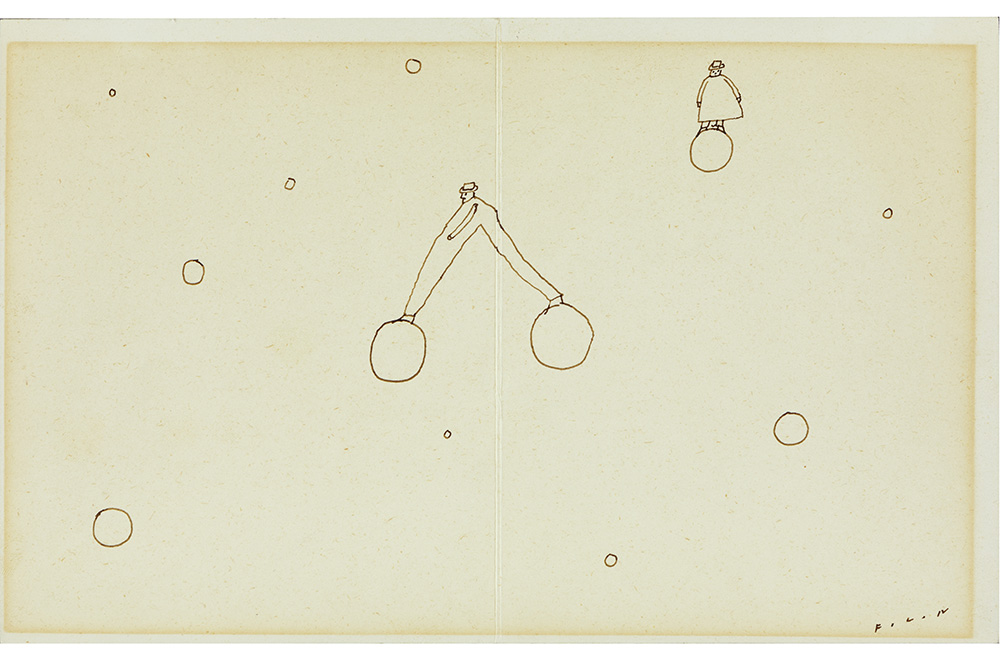 Jean-Michel Folon signed ink drawing with a typical theme, made on the back of an Italian menu from 1972
