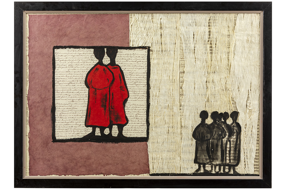 CHINESE SCHOOL – 20° EEUW werk in gemengde techniek met collage : “Le cercle des absents” – 70 x 100