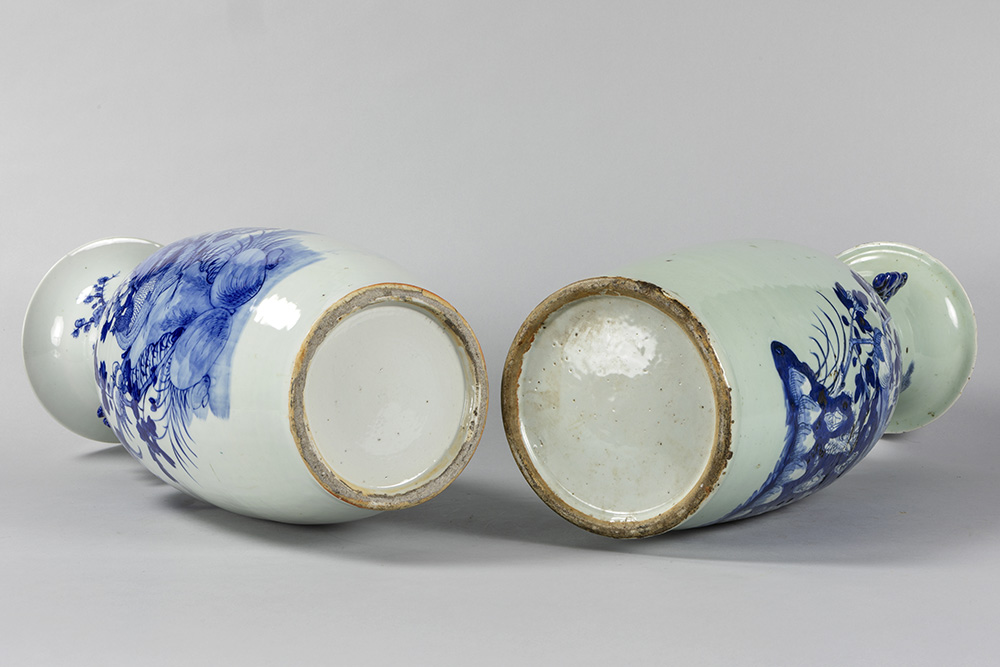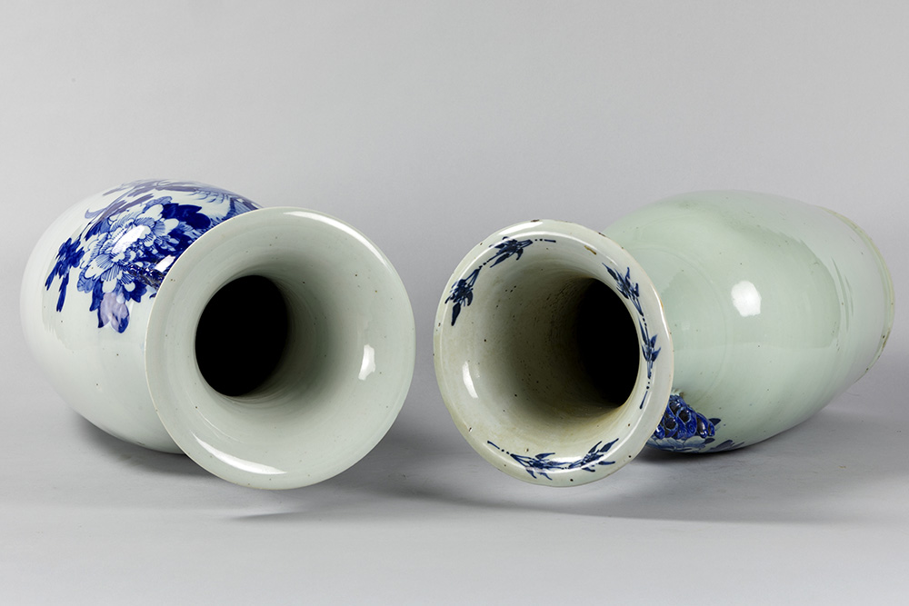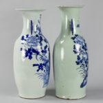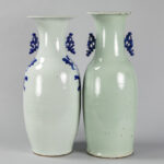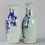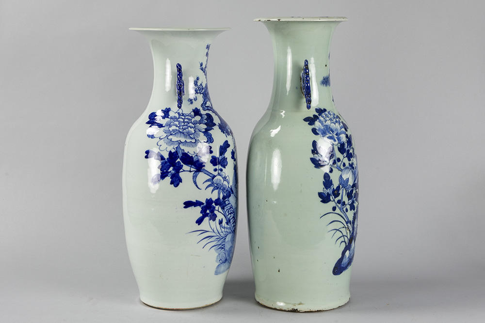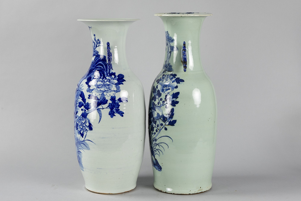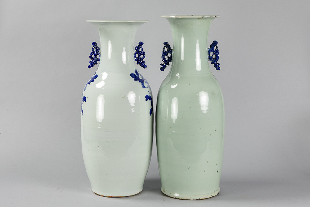 Twee ‘antieke’ Chinese vazen in porselein met blauwwit decor op celadon glazuur – hoogtes : 56 en 59 cm