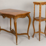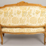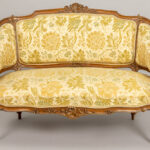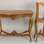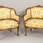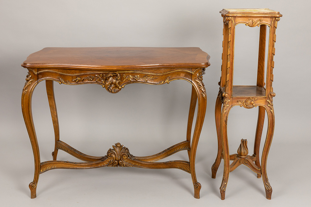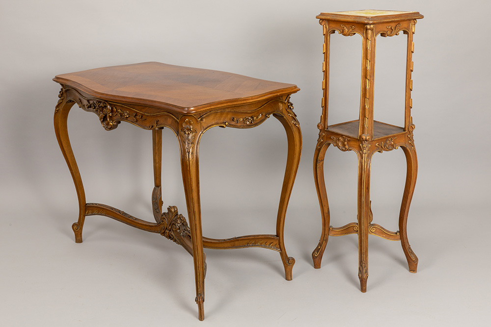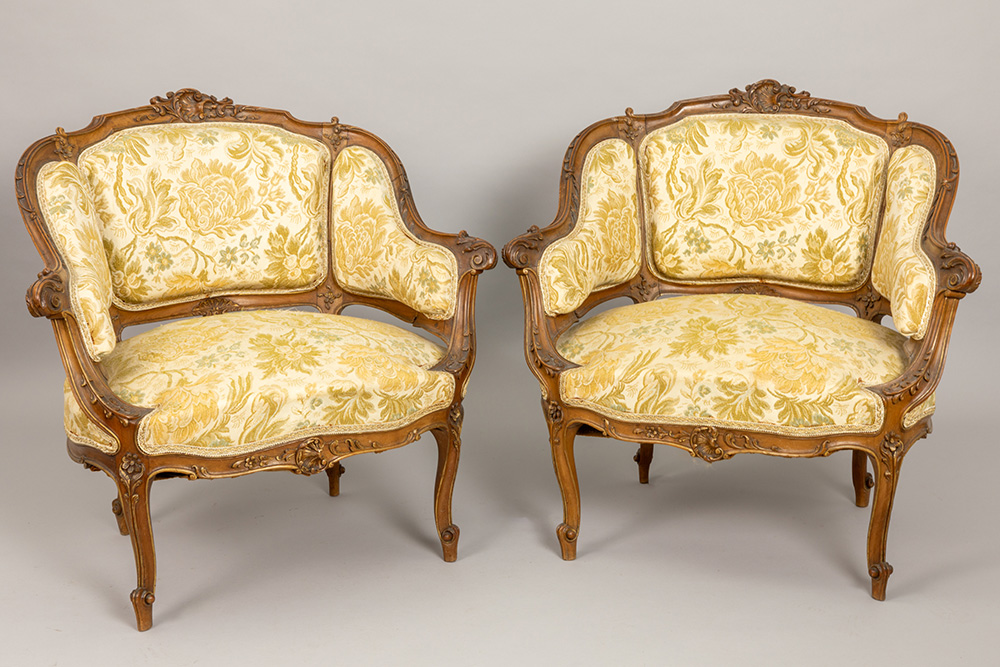 Antiek negendelig Lodewijk XV-salonensemble in notelaar met typisch gesculpteerde ornamentiek bestaande uit vier stoelen (86 x 43 x 42 cm), een tafel (76 x 97 x 59 cm), een tweezit (86 x 122 x 58 cm), een paar fauteuils (79 x 77 x 60 cm) en een piédestalle (hoogte : 100 cm)