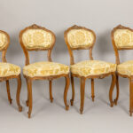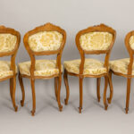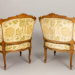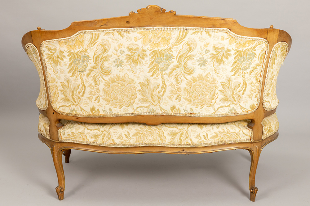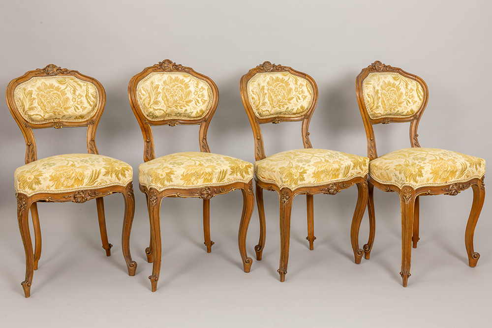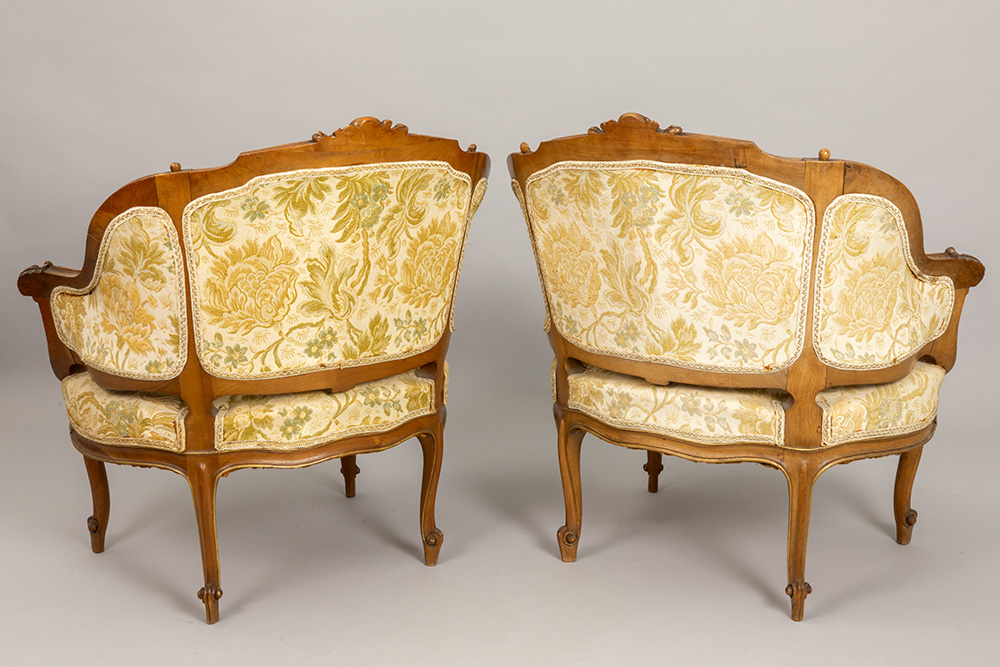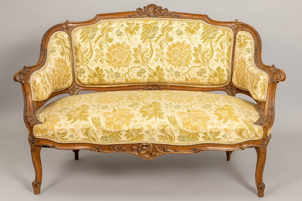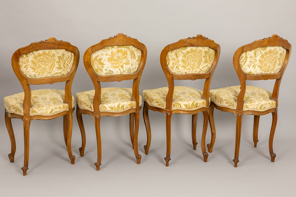 antique Louis XV style salon suite in sculpted walnut with 4 chairs, a table, a settee, a pair of armchairs and a pedestal