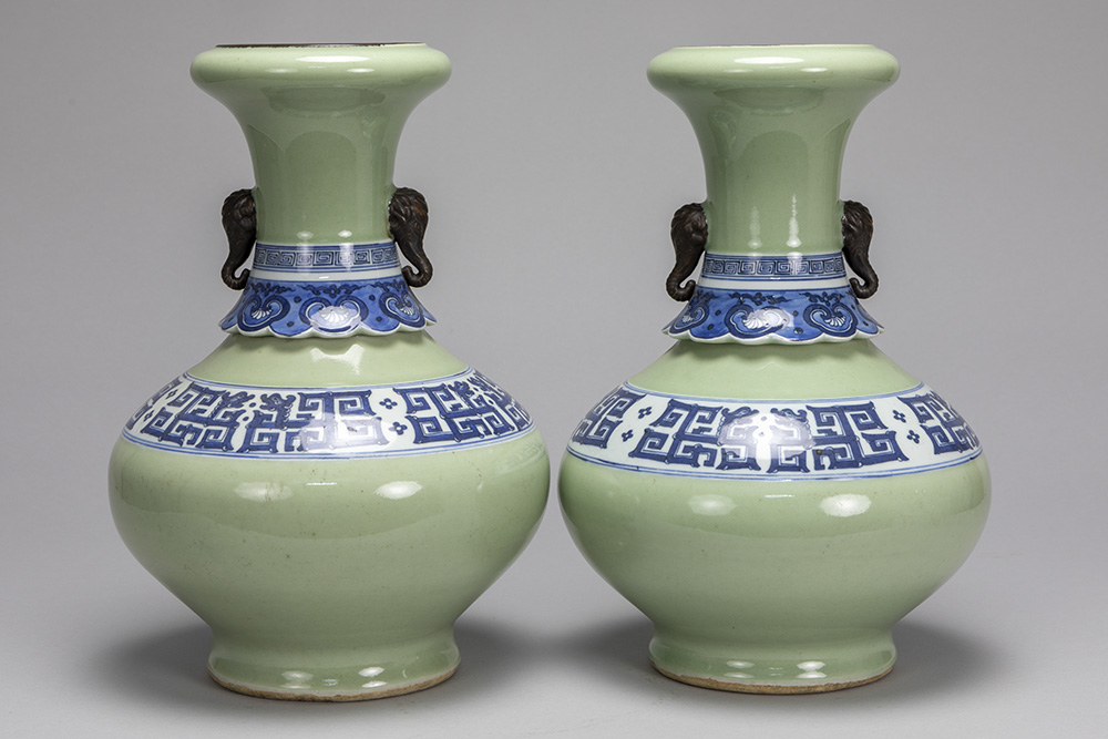 Paar Chinese vazen in porselein met lichtgroene celadon glazuur en met banden met blauwwit decor – hoogte : 37 cm