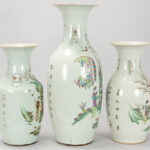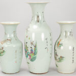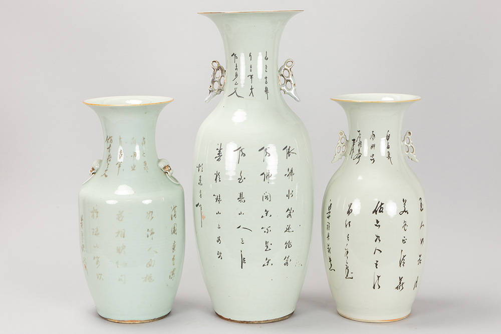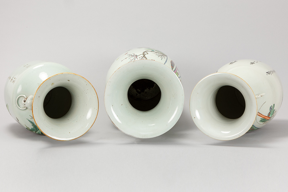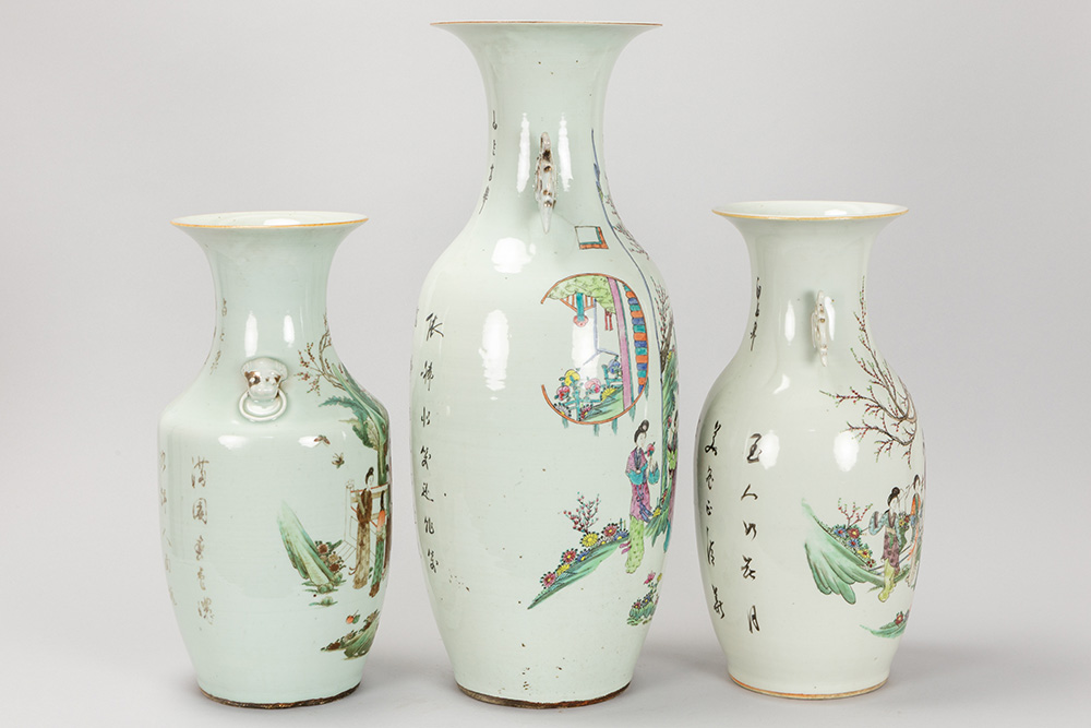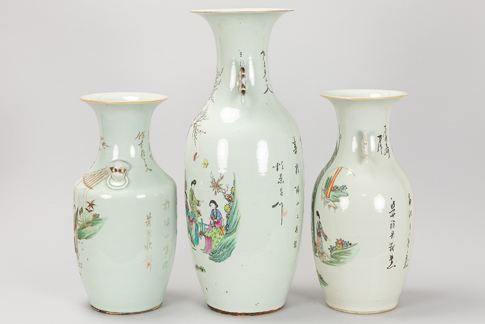 Lot van een grote en twee kleinere Chinese vazen van ca 1900/20 in porselein telkens met een polychroom figurendecor – hoogtes : 42,5 en 58,5 cm