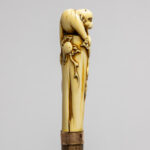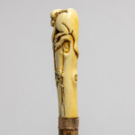 late 19th Cent. European cane with a total height of 93,5 cm and grip in Japanese ivory depicting a monkey on a bush, attached with a ring in copper