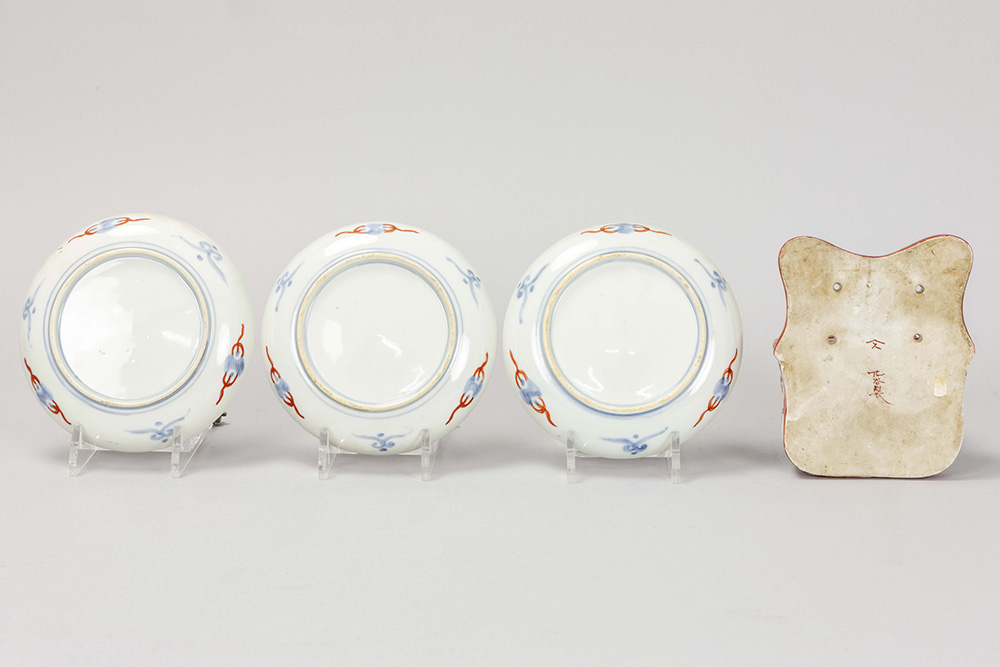 Lot (4) negentiende eeuws Japans met drie Imari-bordjes in porselein en een gemerkt “Kitani”-wandschaaltje