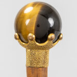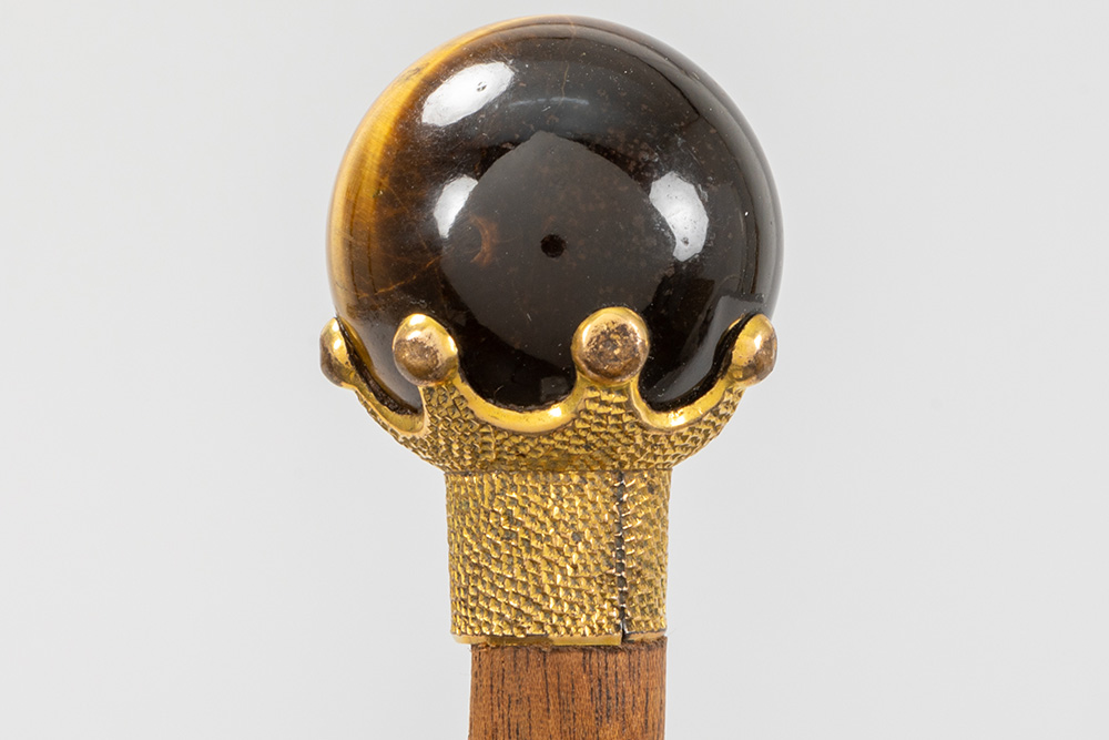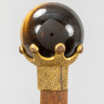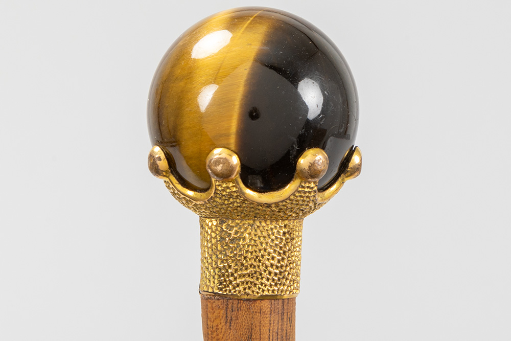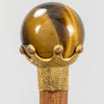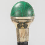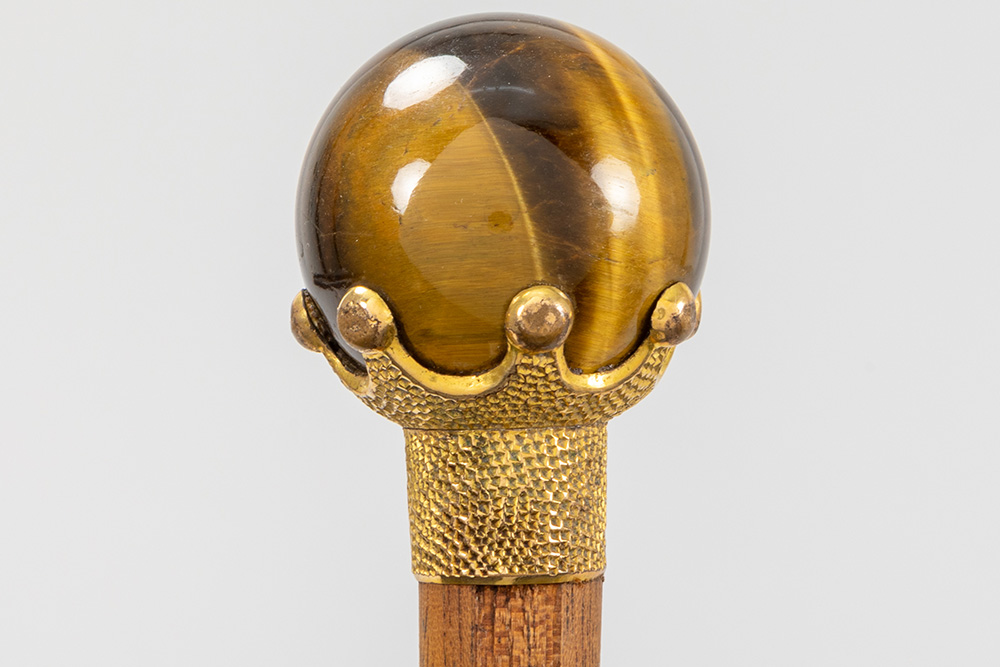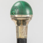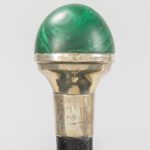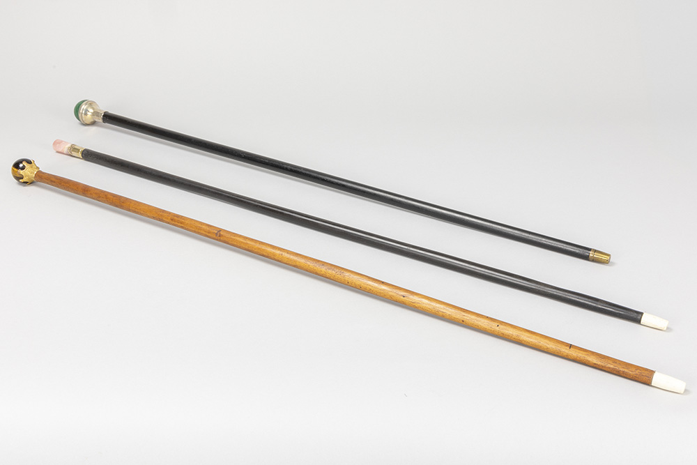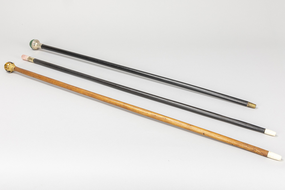 three antique walking sticks, each with a grip in a type of semi-precious stone