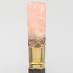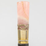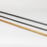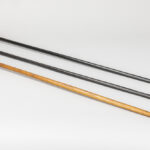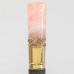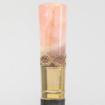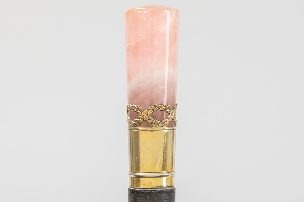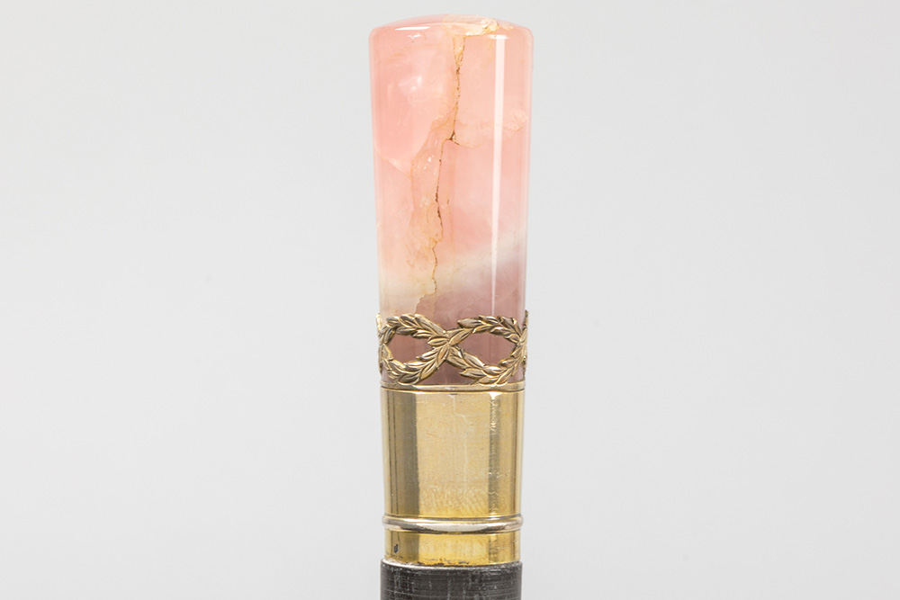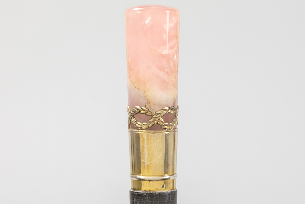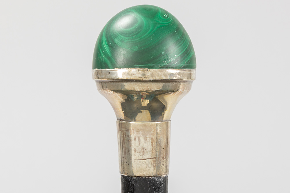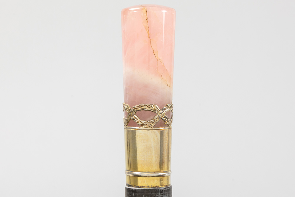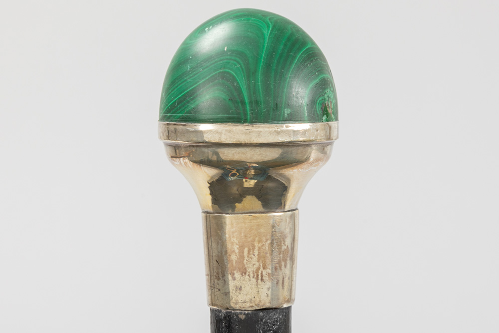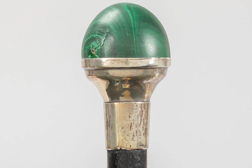 Lot met drie wandelstokken, telkens met greep in een halfedelsteensoort (malachiet, tijgeroog en roze kwarts) – ca 90 cm hoog