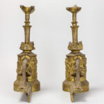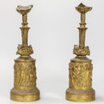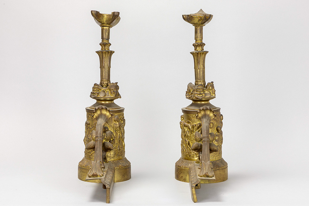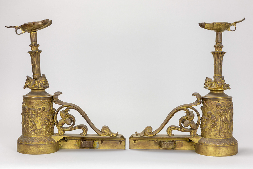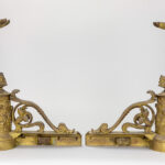 FRANKRIJK – late 18° EEUW zeer mooi paar antieke neoclassicistische chenets in gedoreerde brons met aparte vorm en zeer verfijnde ornamentiek met onderaan een fries met bacchanten, met een schaaltje met maskers, … – hoogte en diepte : : 47 en 39 cm