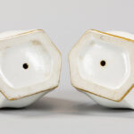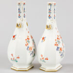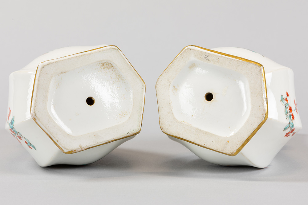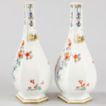 Paar antieke, allicht Franse vaasjes met zeshoekige opstand in porselein met een polychroom floraal decor – hoogte : 25 cm