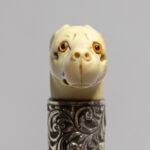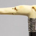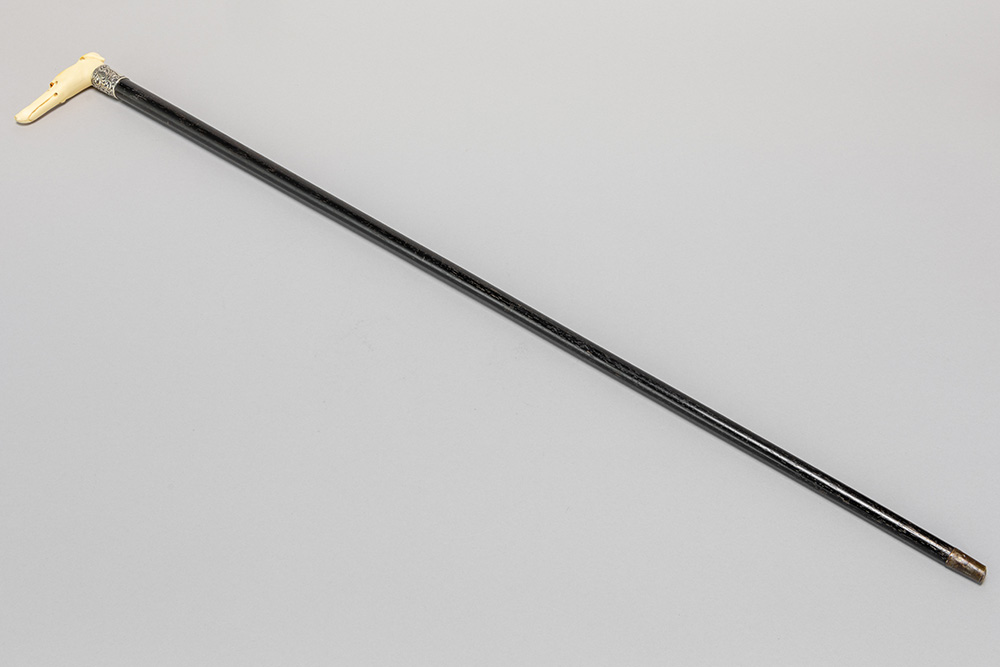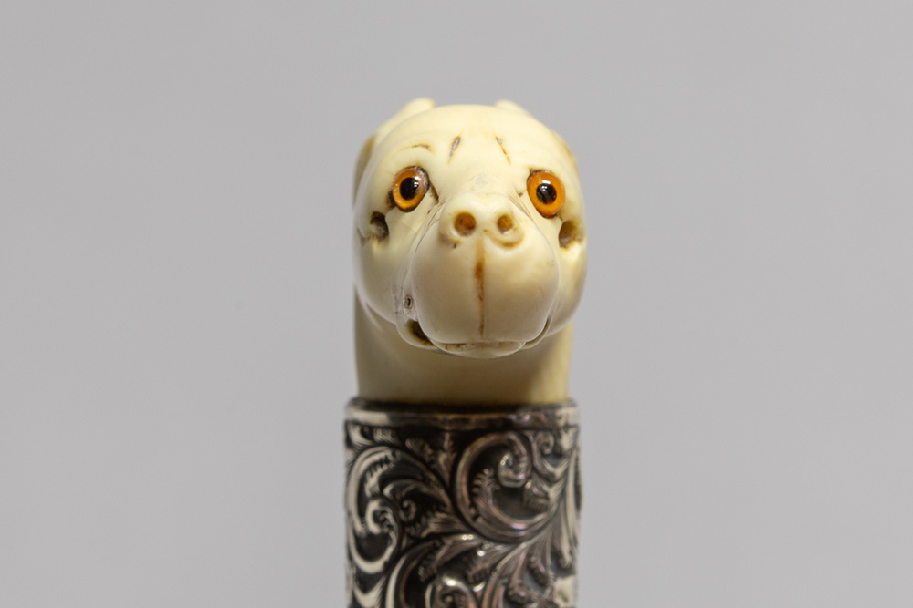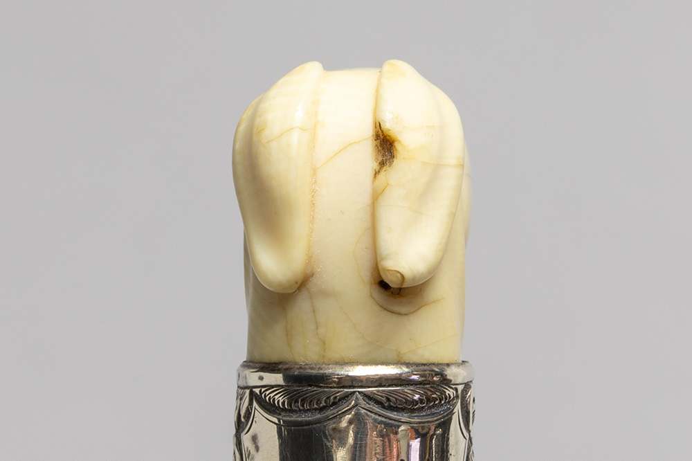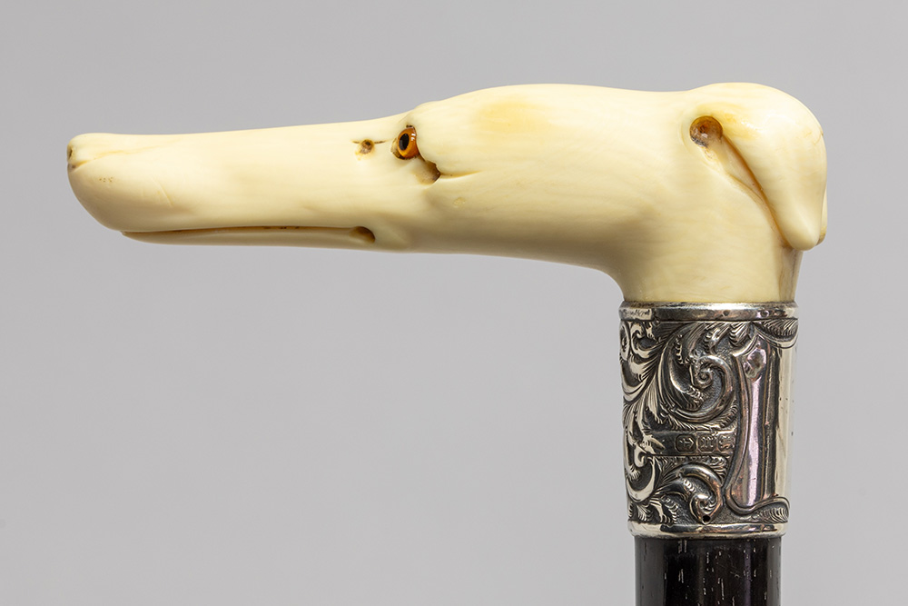 19th Cent. English cane with a total height of 91 cm and grip in ivory of a greyhound with inlaid glass eyes, attached with a wide ring in “Birmingham 1894” marked silver