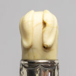 Negentiende eeuwse Engelse wandelstok met een totale hoogte van 91 cm en met greep in ivoor in de vorm van een windhond met ingelegde glazen ogen – met een vrij brede bevestigingsring in zilver, gemerkt “Birmingham 1894″