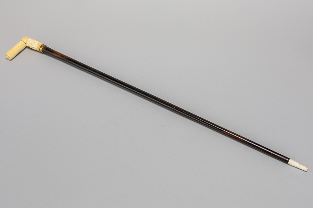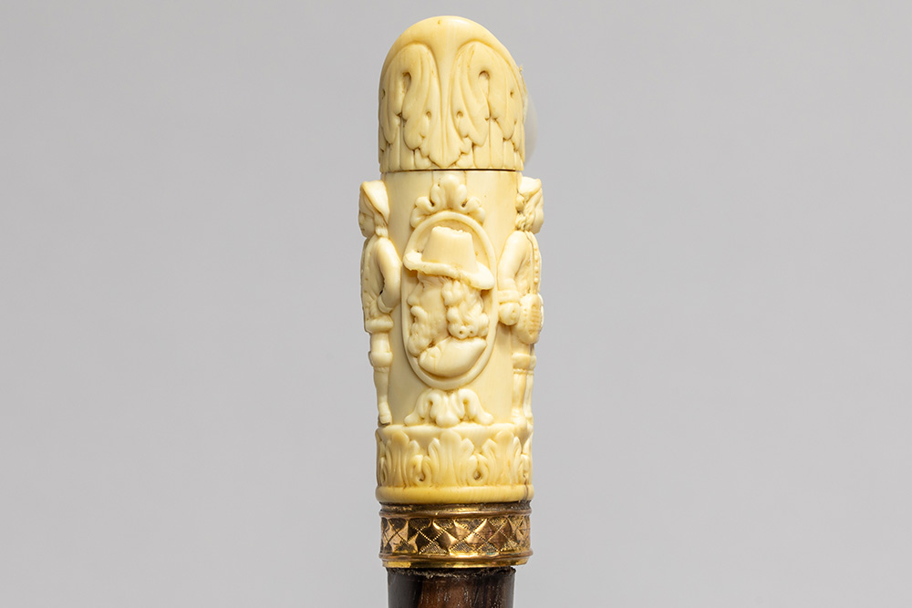 Negentiende eeuwse Europese, allicht Franse, wandelstok met een totale hoogte van 92 cm met greep in ivoor in drie delen bestaande uit een gesculpteerde cilindervorm en hoekstuk, welke dient als verbinding voor de dwarse cilindervorm die eindigt op een gesculpteerd (satirisch) mansportret – met bevestigingsring in geel metaal en met ivoren punt