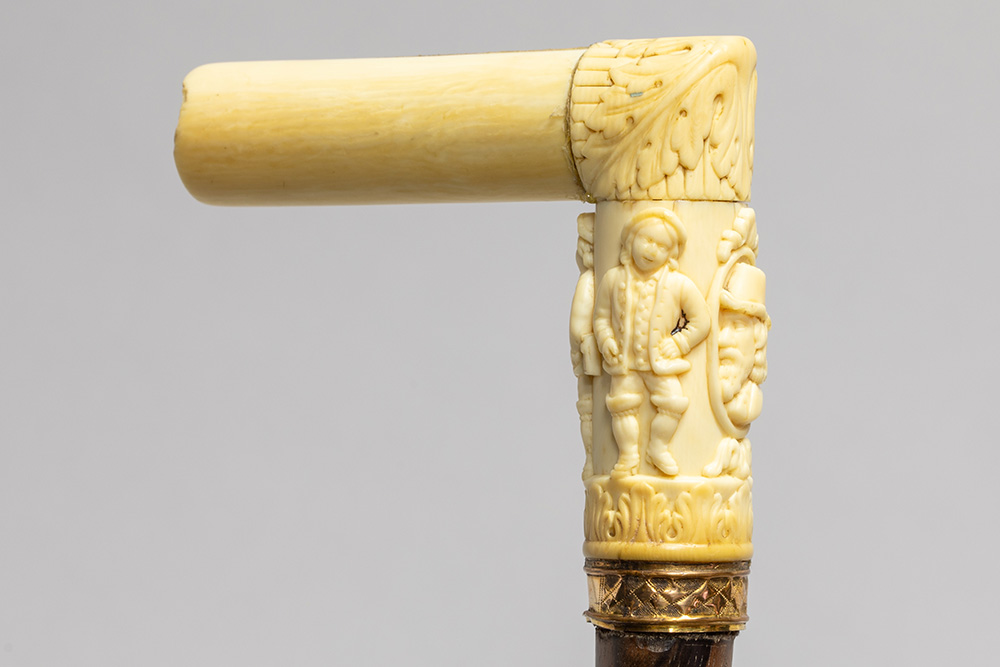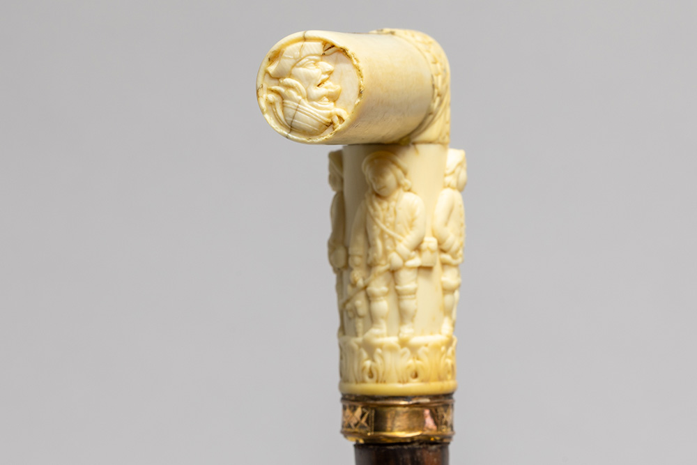 19th Cent. European, probably French, cane with a total height of 92 cm and grip in three pieces of sculpted ivory, attached with a ring in yellow metal and an ivory tip