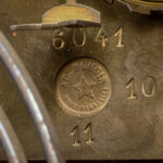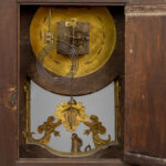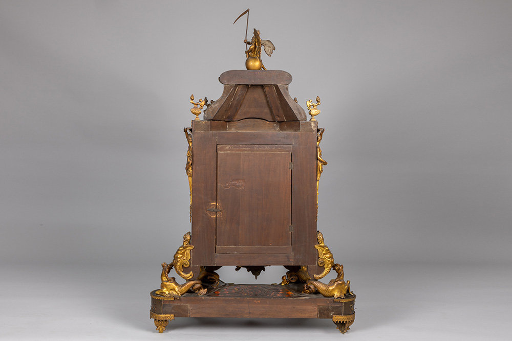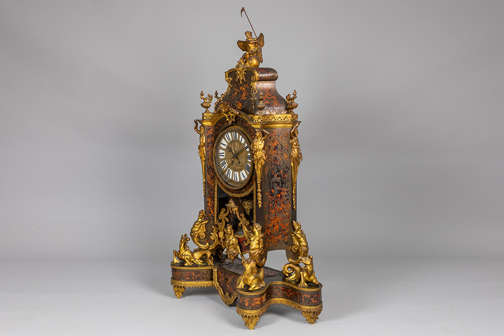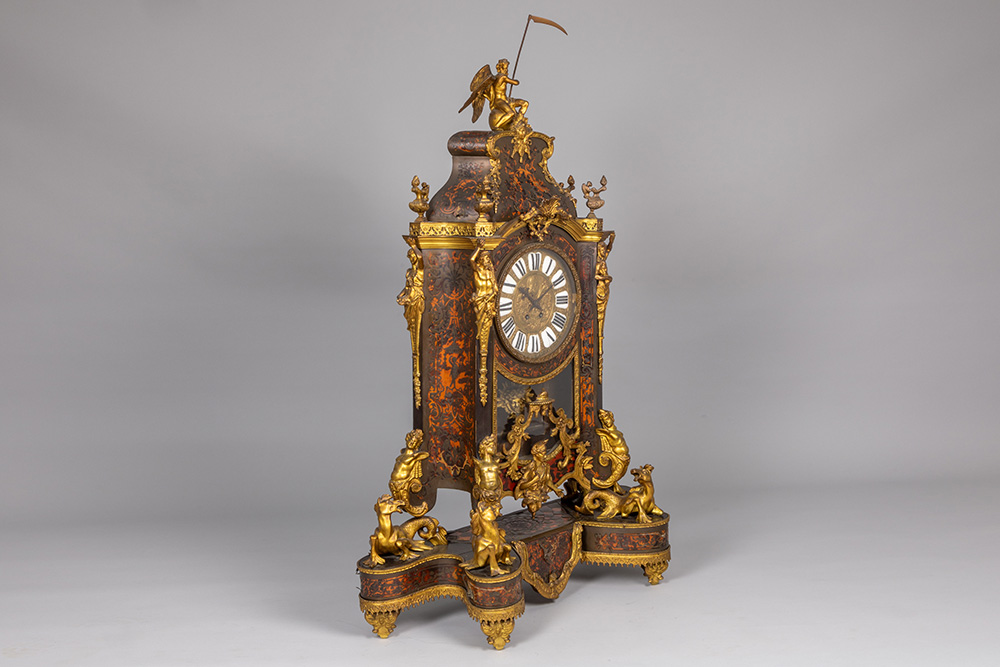 Grote negentiende eeuwse kartel op bijhorende sokkel in barokstijl met kast in ‘Boulle’ (met ebbenhout, schildpad en koperinleg) met typisch beslag in gedoreerde brons en met “AD Mougin” gemerkt werk – hoogte en breedte : 135 x 84 cm