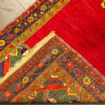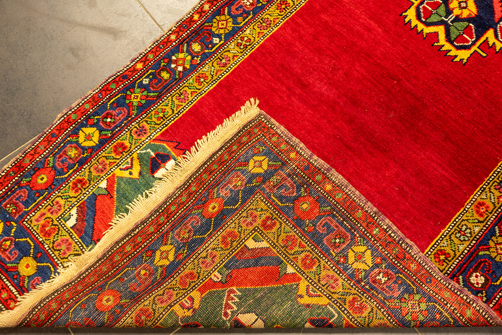 Vrij lange, ‘antieke’ Kaukasische loper in wol op wol met drie medaillon op een rode fond – 455 x 110 cm