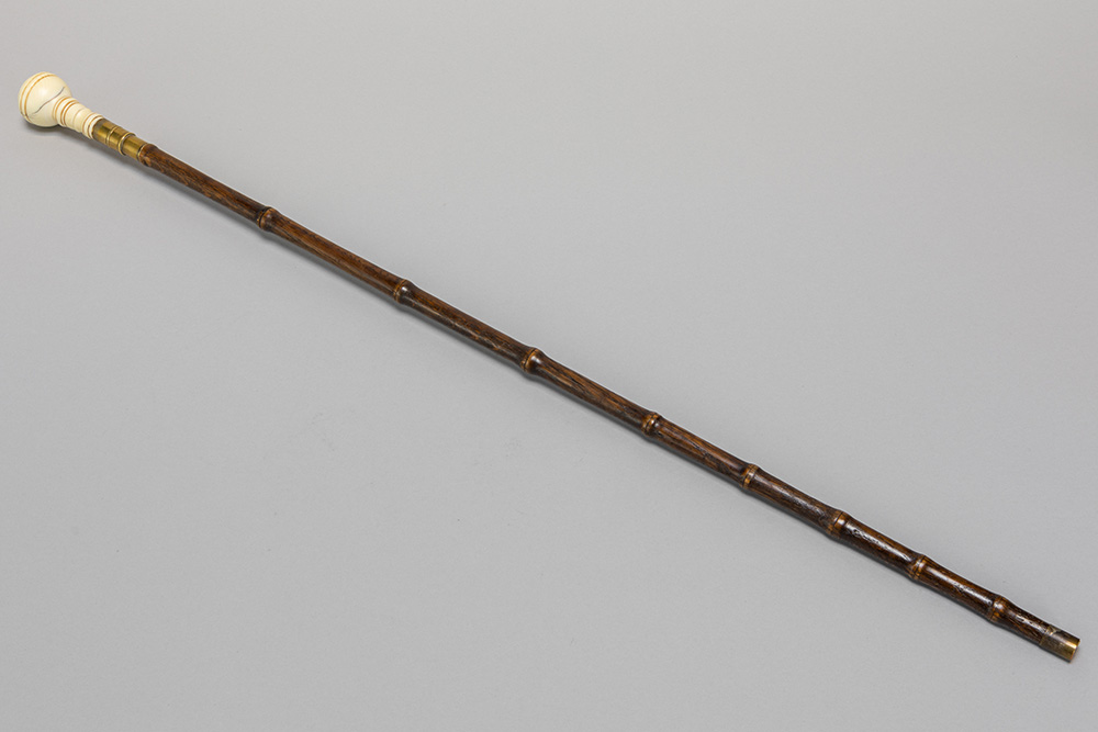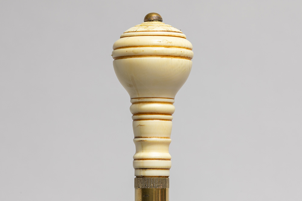 Negentiende eeuwse Europese wandelstok met een totale hoogte van 87 cm met afschroefbare greep in ivoor, die een degen verbergt, met een ajuinvorm uitlopend op een tapse baluster, versierd met vrij diep ingekerfde parallelle banden die nog sporen van de oorspronkelijke polychromie tonen en de knop die bekroond wordt door een halve bol in metaal – met bevestigingsring in koper