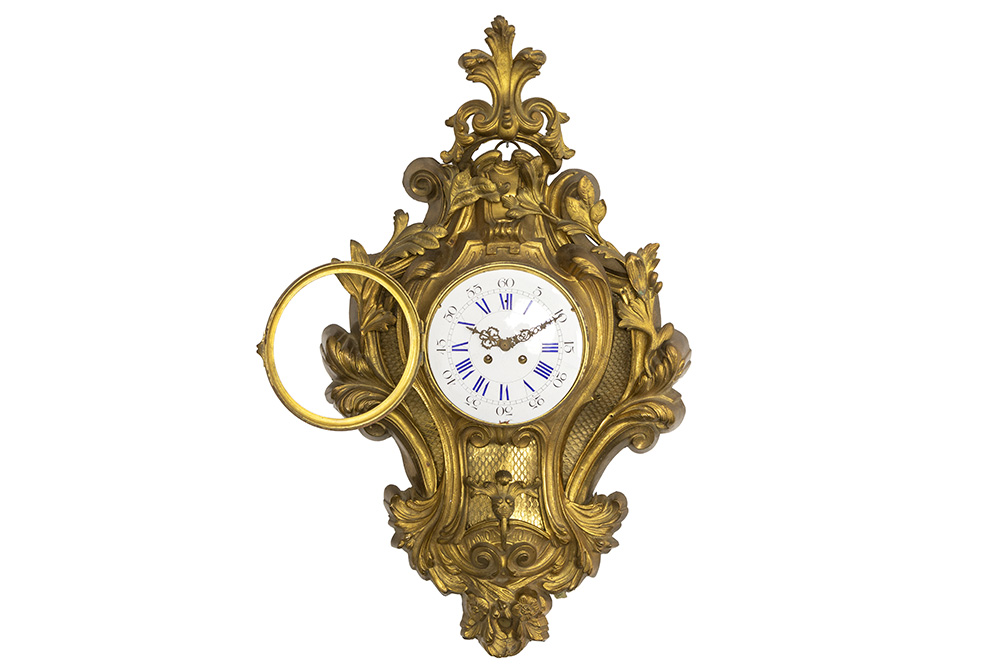 Vrij grote negentiende eeuwse Franse Napoleon III – wandkartel met typische rocaillevorm in gedoreerde brons en met een werk getekend “S. Marti” – hoogte en breedte : 73 en 44 cm