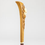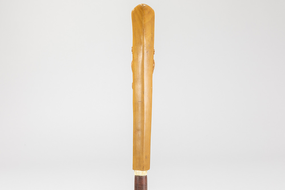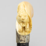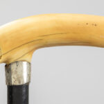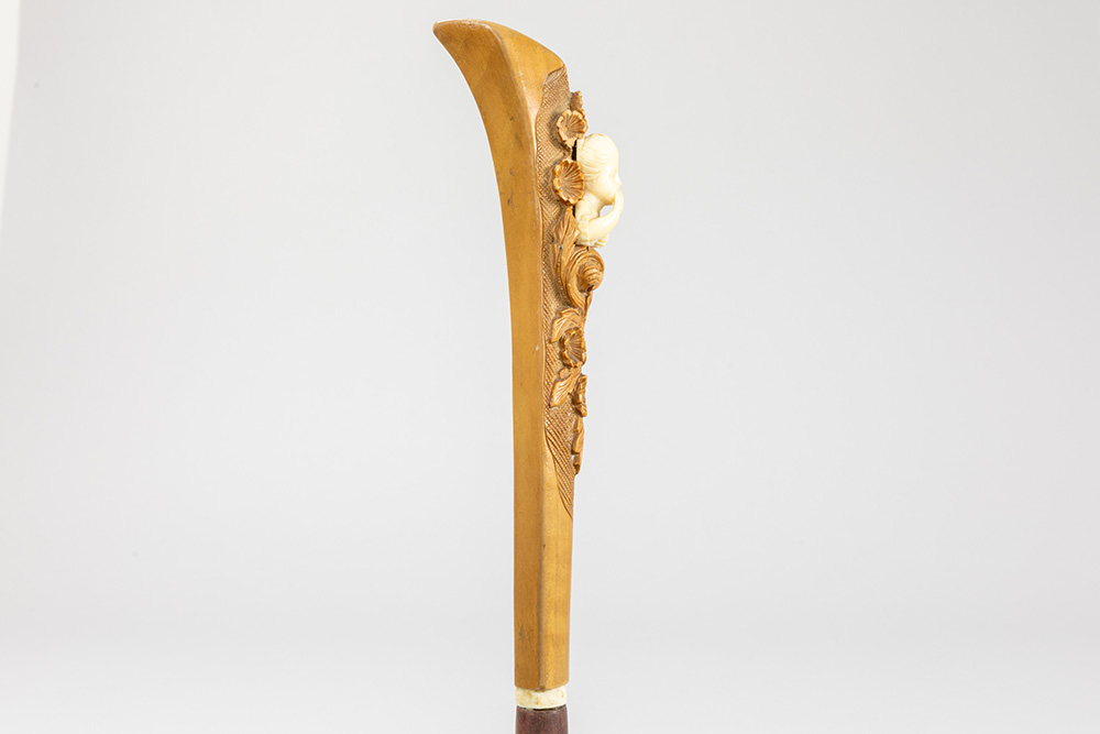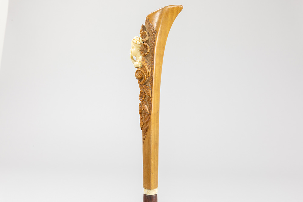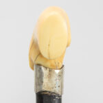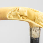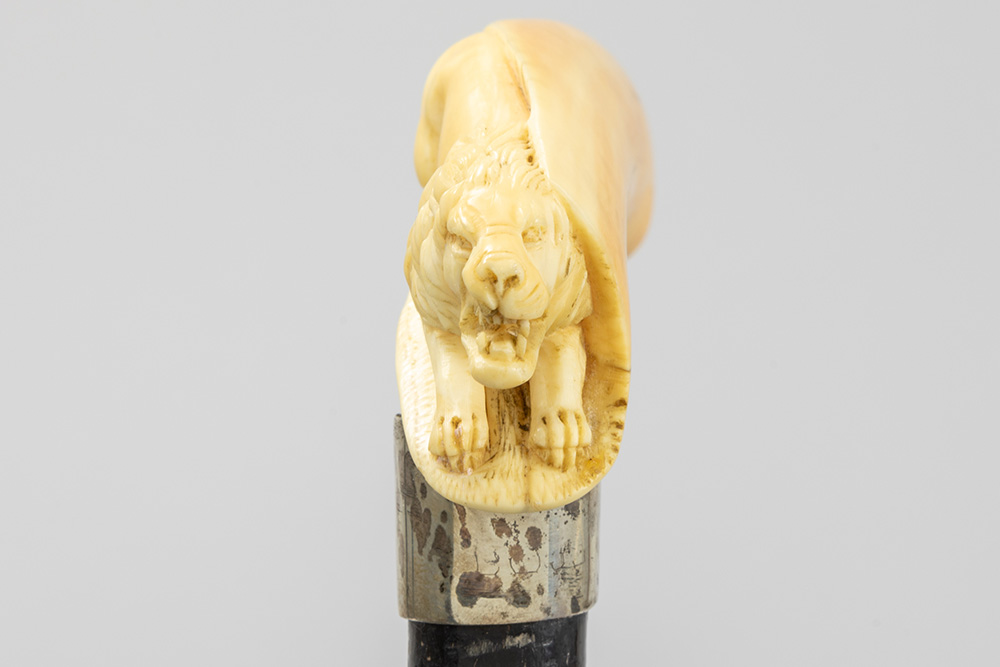 Lot met twee wandelstokken, één met greep met leeuw en één met kinderbuste in been – 86 en 93 cm hoog