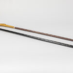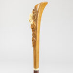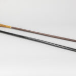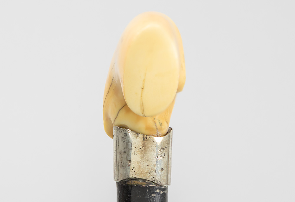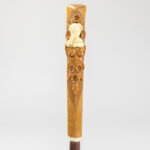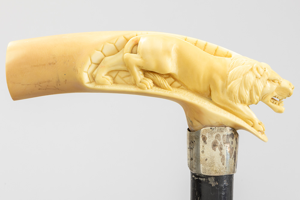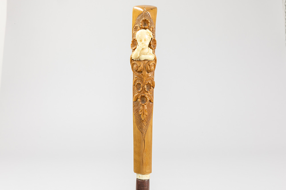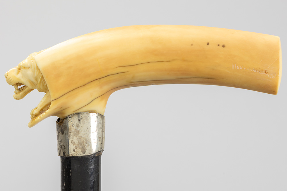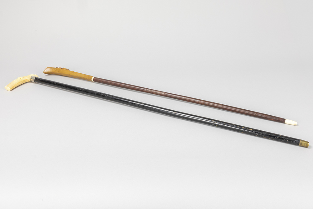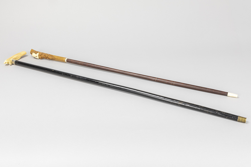 two antique walking sticks , one lion shaped grip and one with a child’s bust