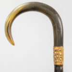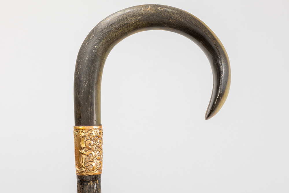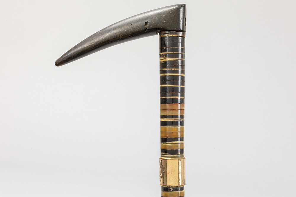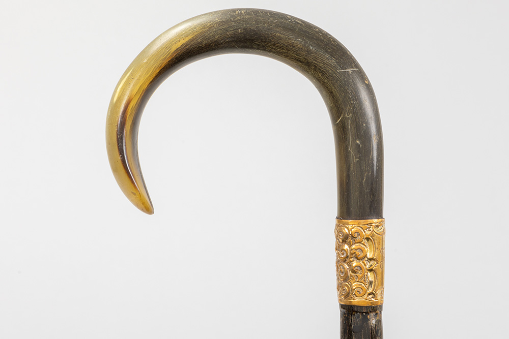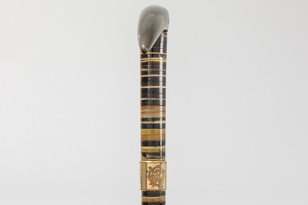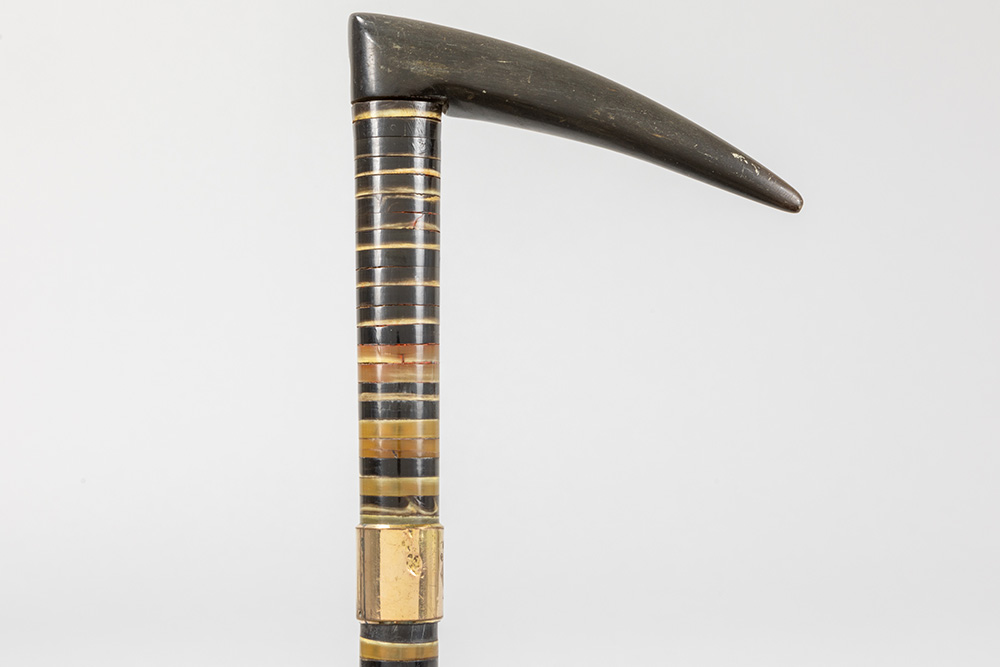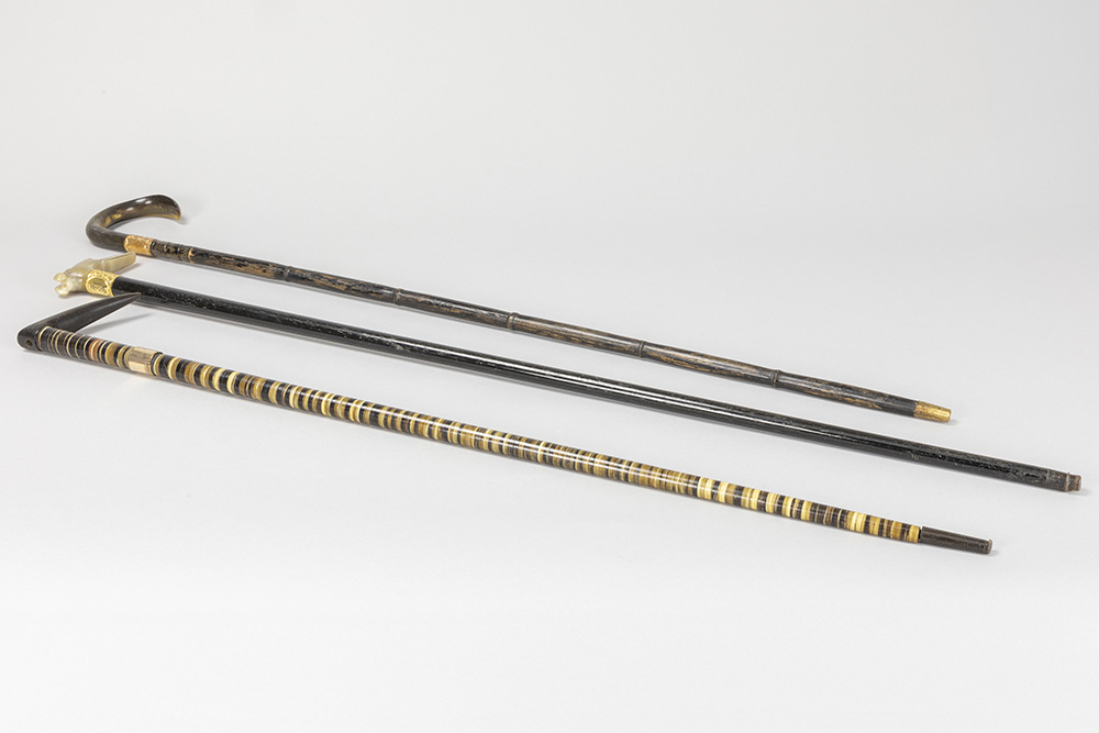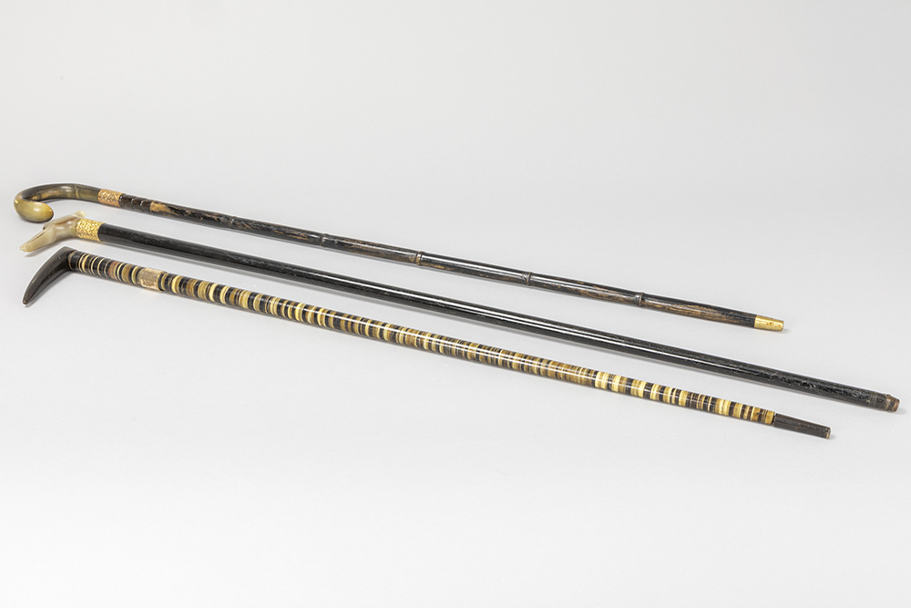three antique walking sticks , each with a grip in horn