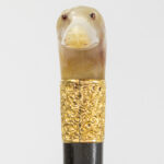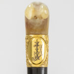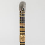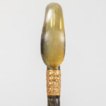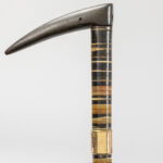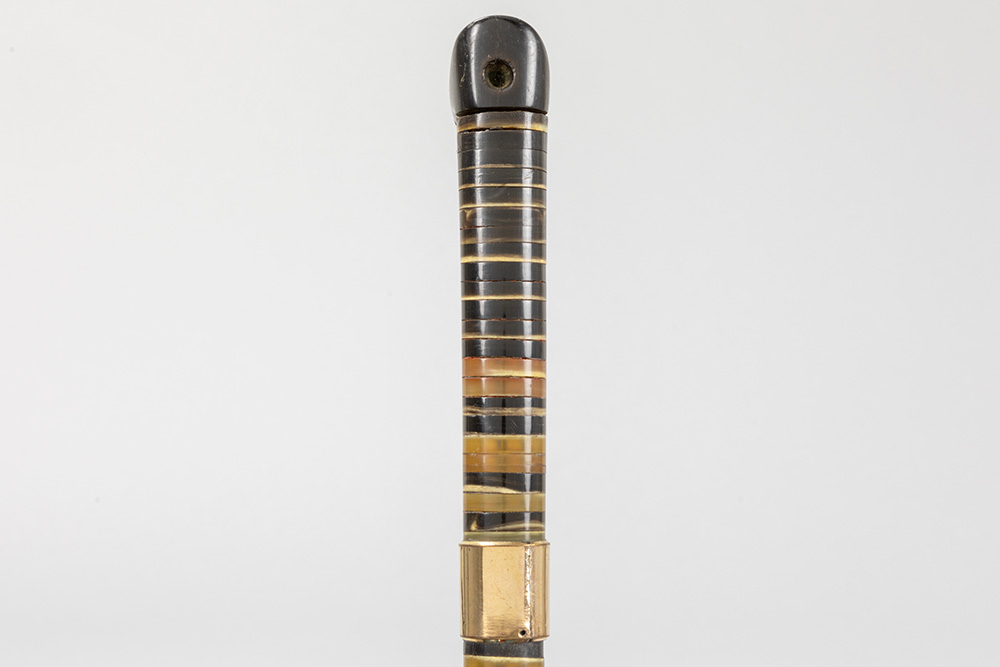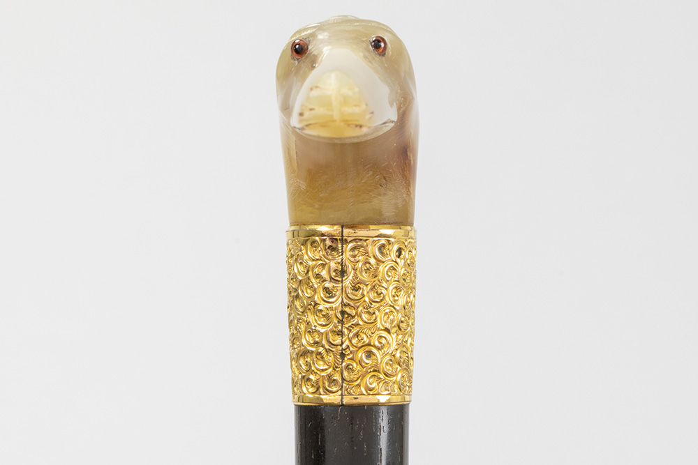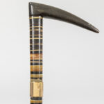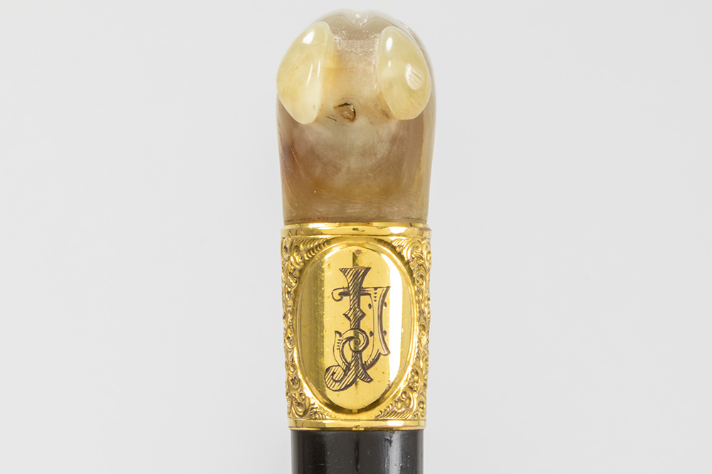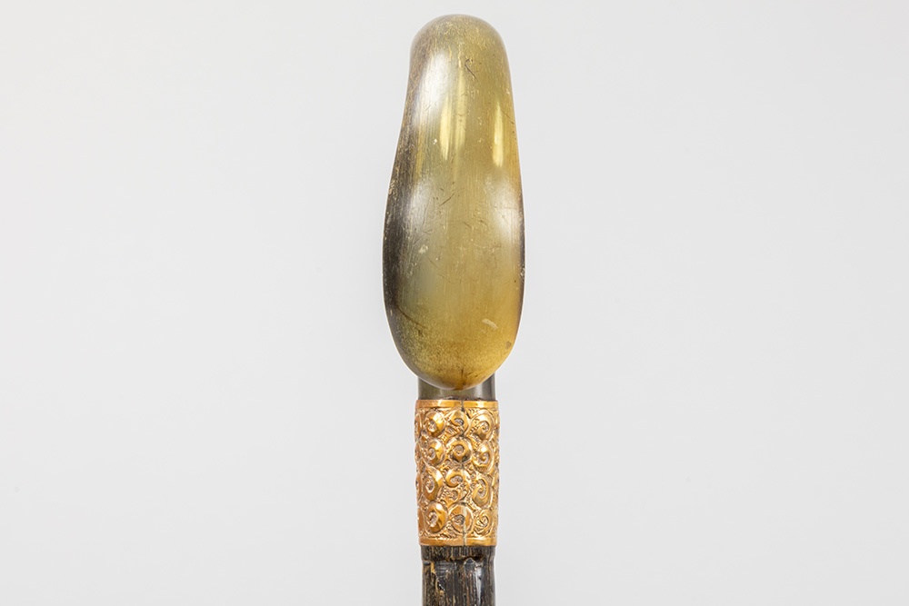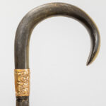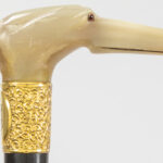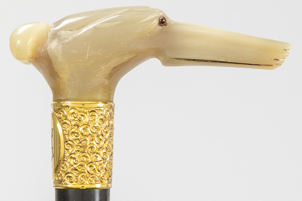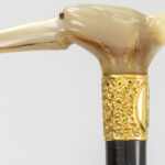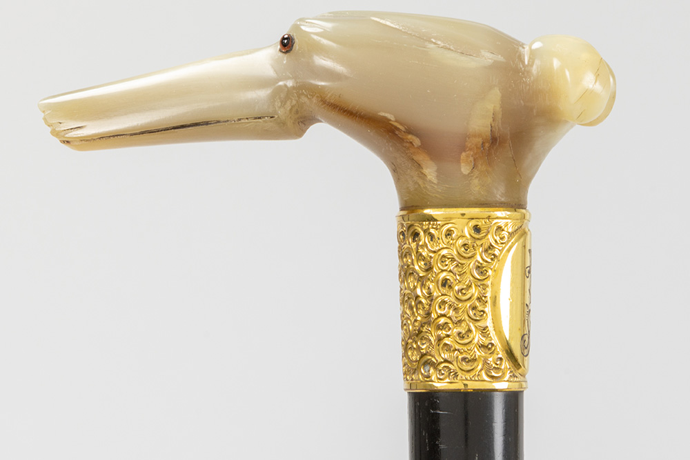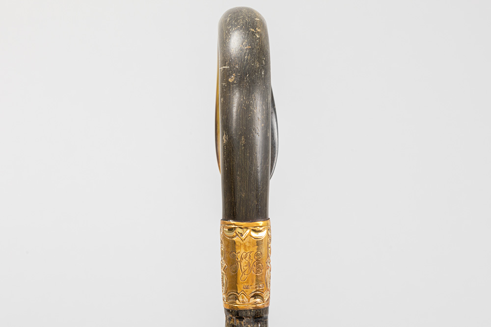 three antique walking sticks , each with a grip in horn