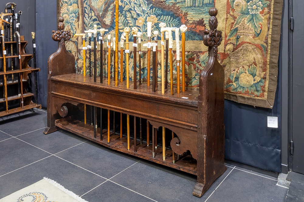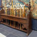 Achttiende eeuwse Engelse gotische kerkbank in eik met gesculpteerde pinakels herkomst : Universiteitskerk “Great St Mary” van Cambridge – 109 x 165 x 40 cm met oud etiket op onderkant