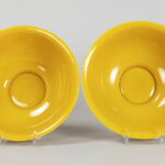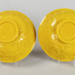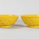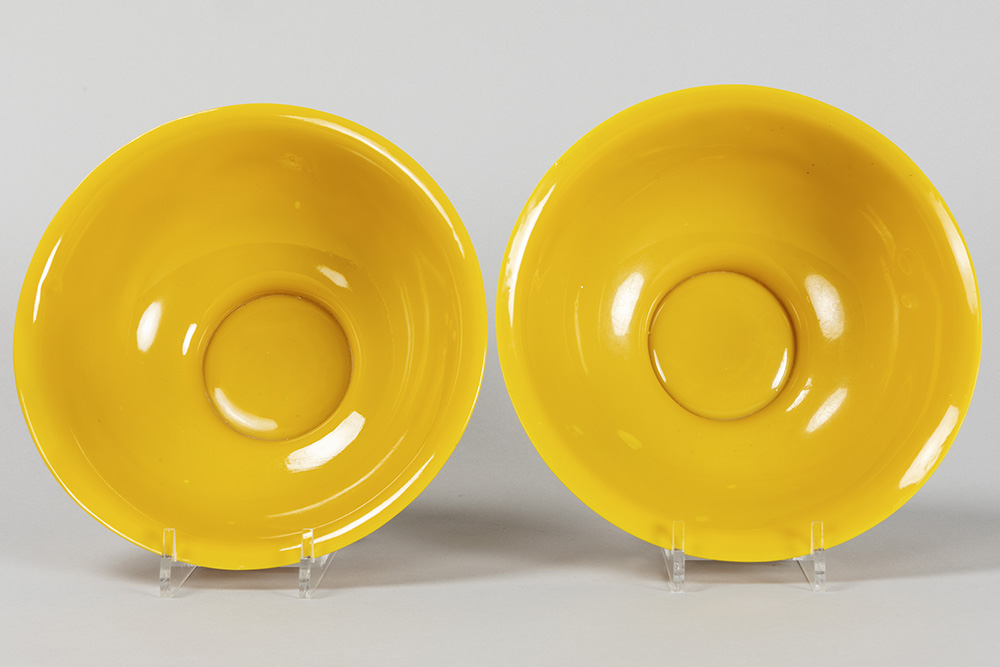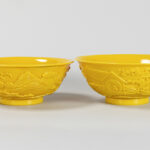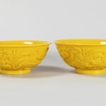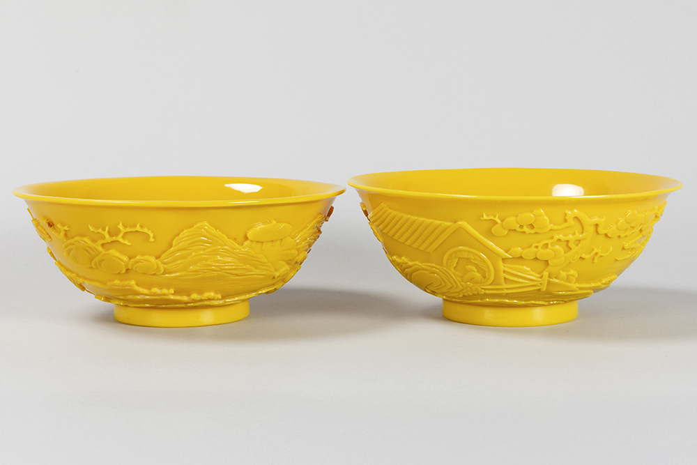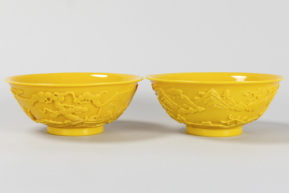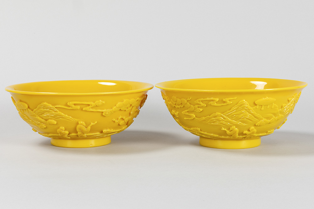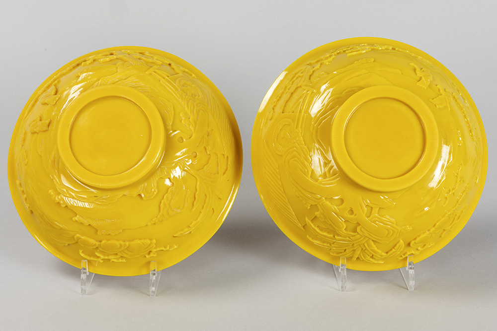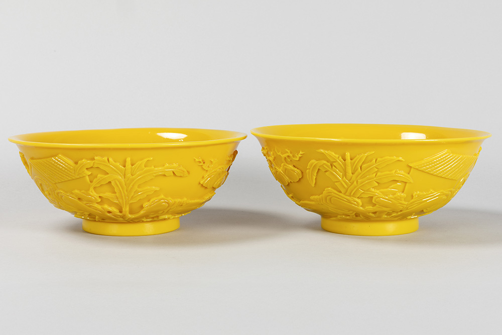 PEKING GLAS – 19°/20° EEUW paar bowls met landschapsdecors in geel glas met reliëfdecor – diameter : 23 cm