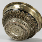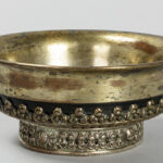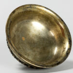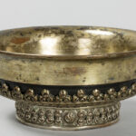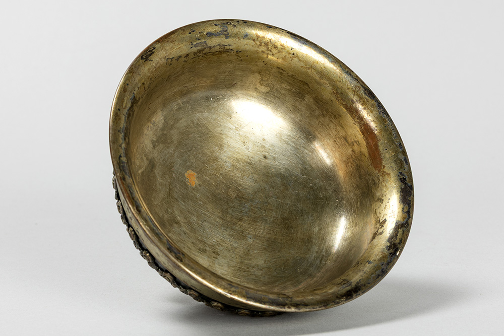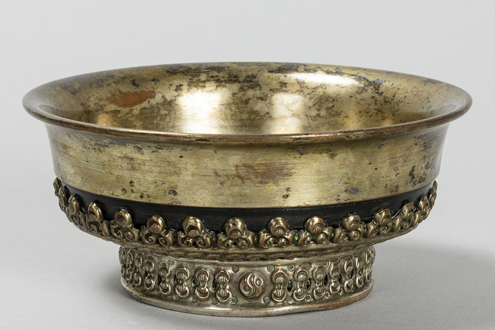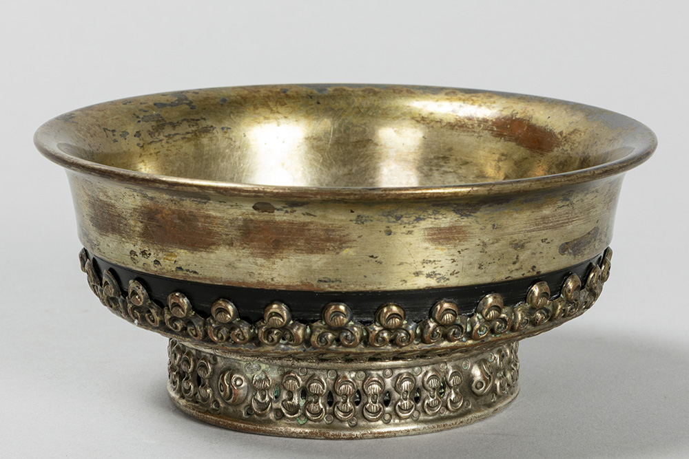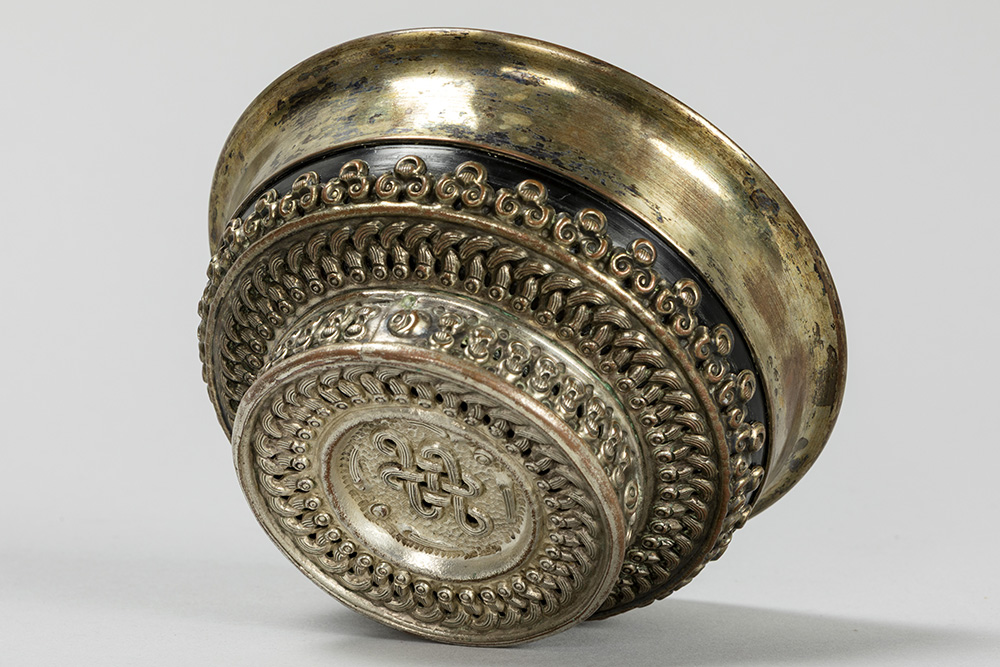 Tibeto-Nepalese botertheetas in hout met beslag in verzilverd koper – diameter : 12,3 cm