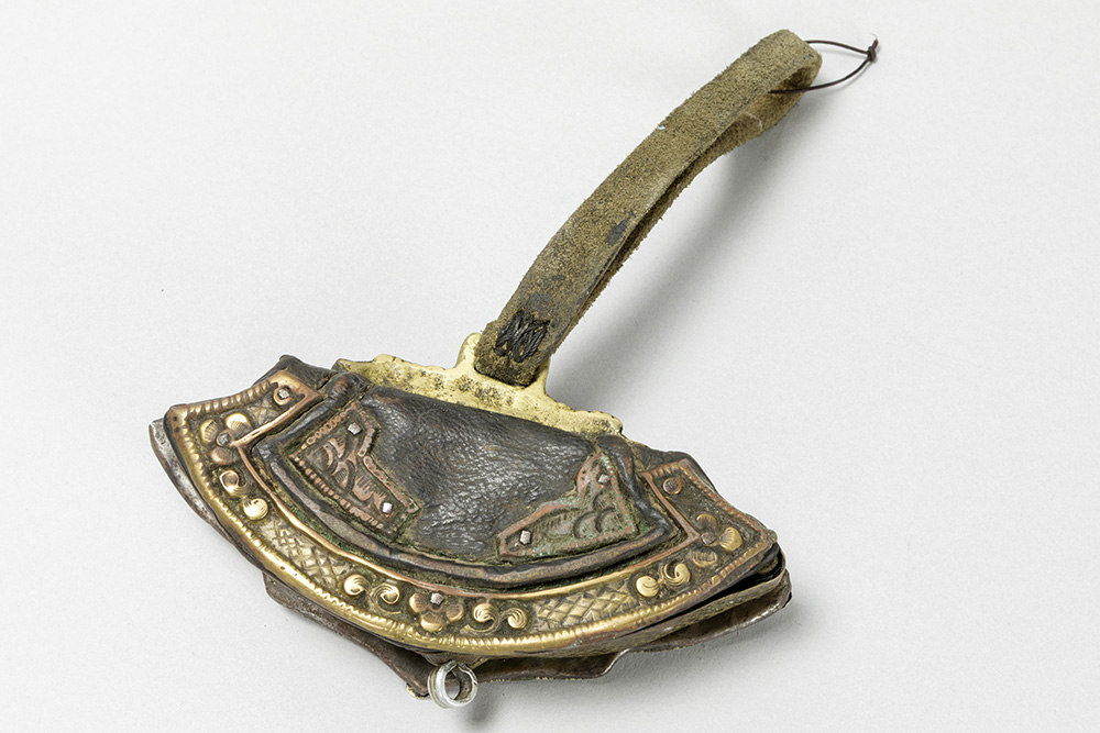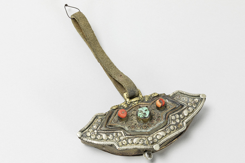 19th Cent. Tibetan flint pocket in leather, brass and silver with turquoise and coral