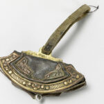 19de eeuws Tibetaans karakteristiek vuursteenzakje in leder, koper en zilver en bezet met cabochons in turkoois en bloedkoraal – met typische ornamentiek in repoussé – hoogte en breedte : 20 en 15 cm