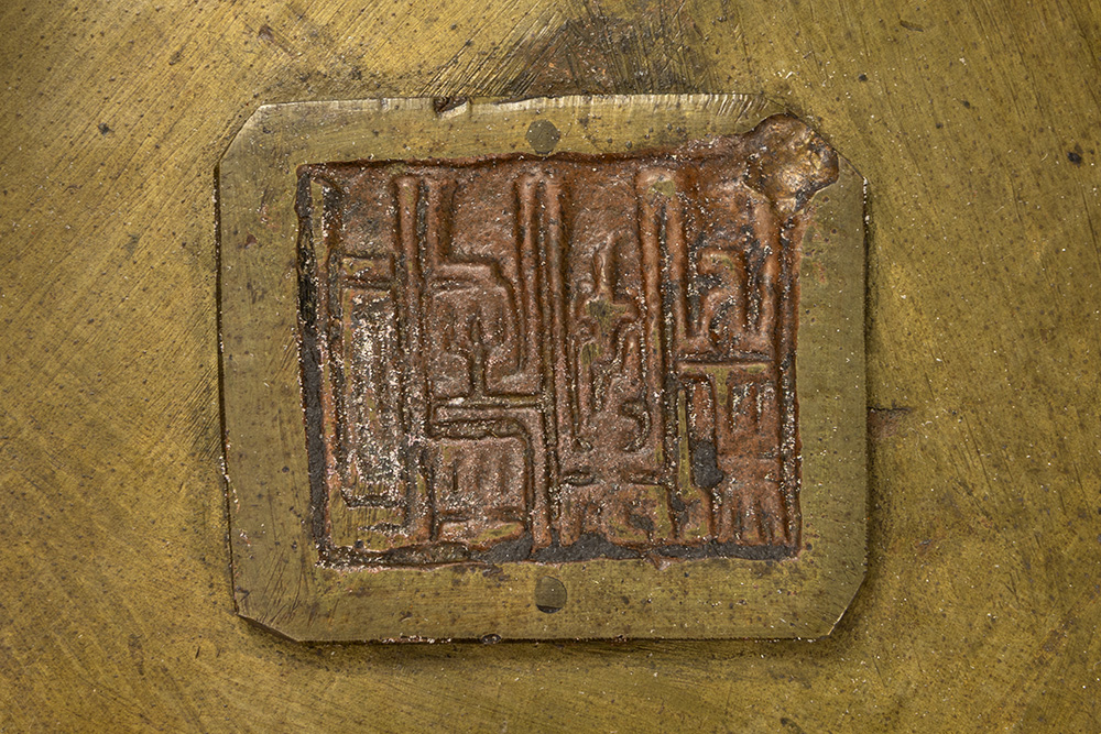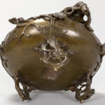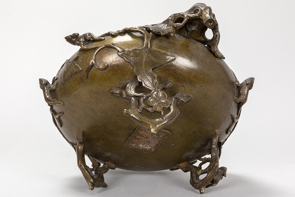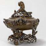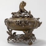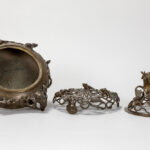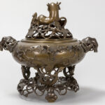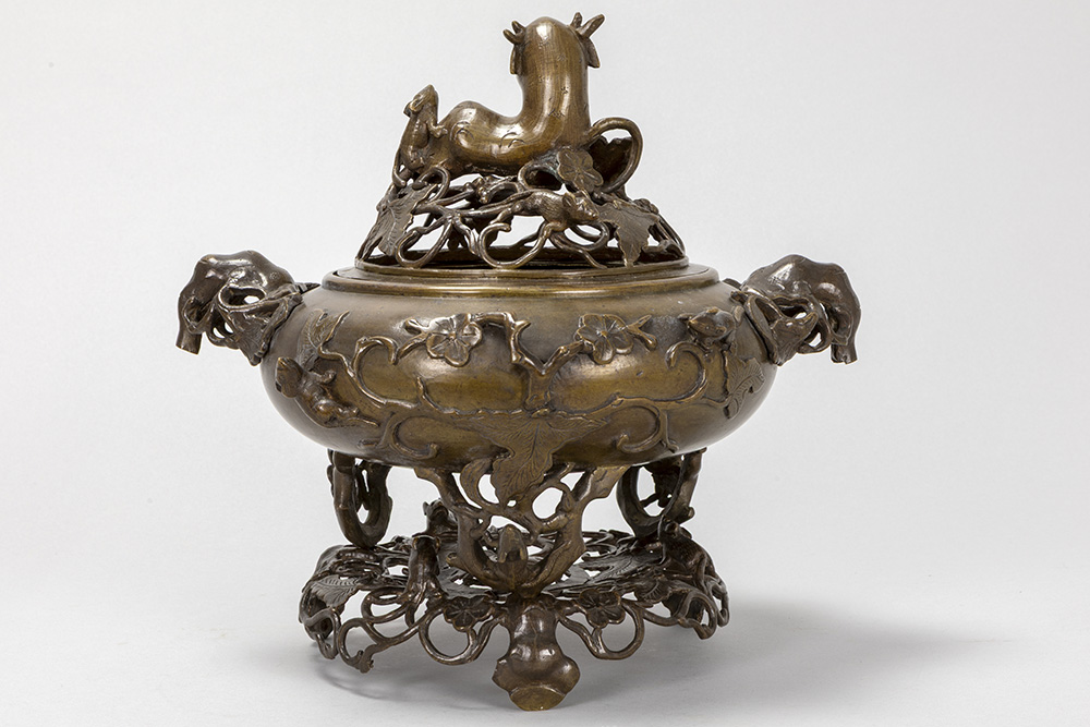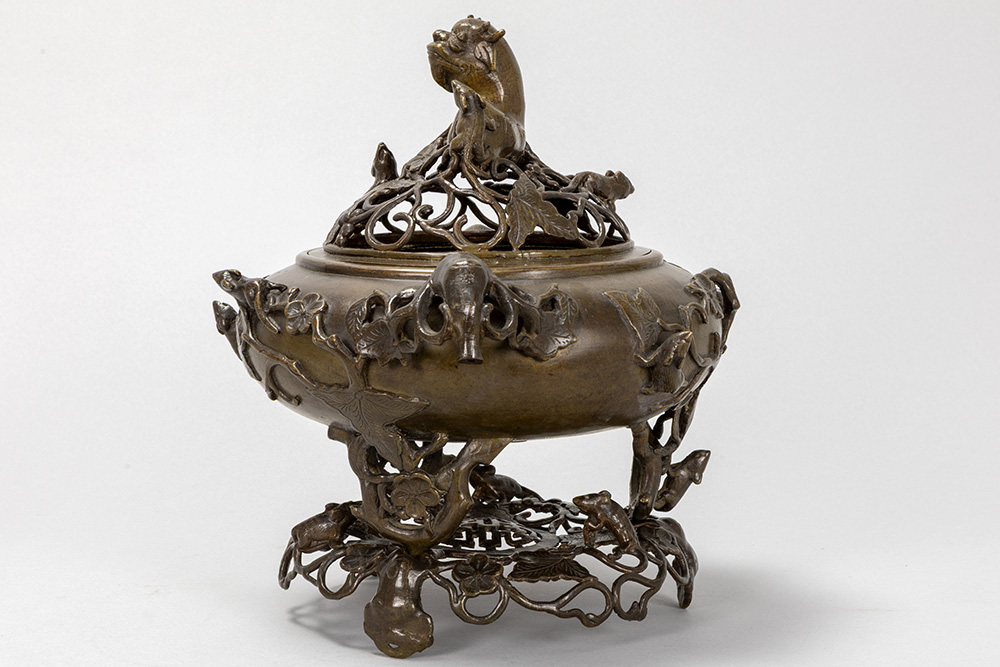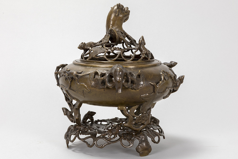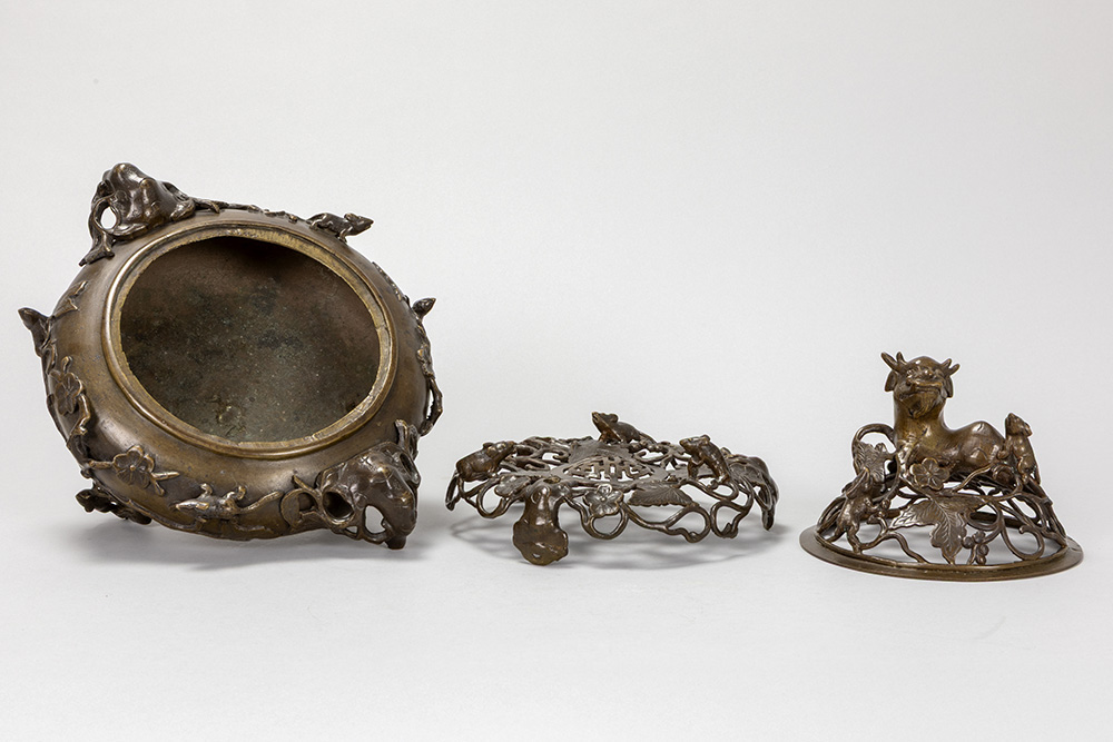 antique Chinese bronze incense burner on a beautiful, openwork base and with a lid with a fô-dog