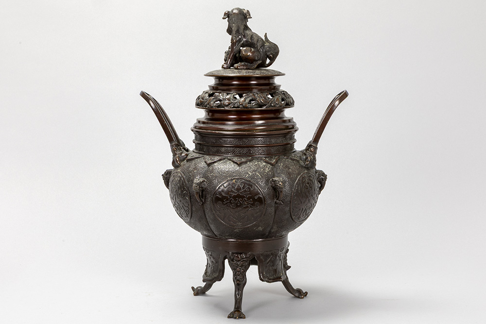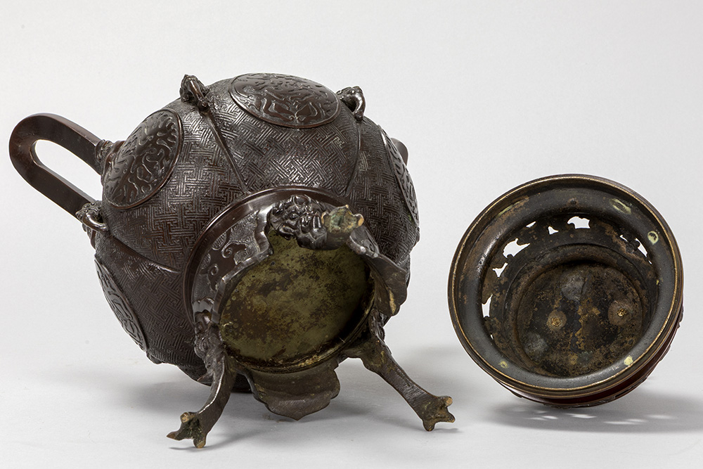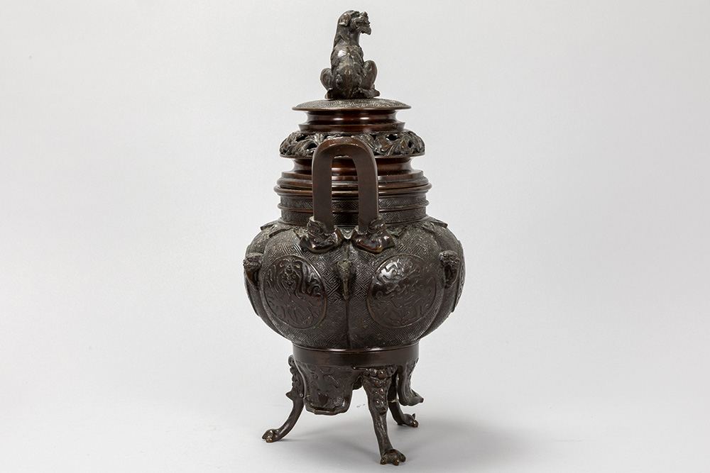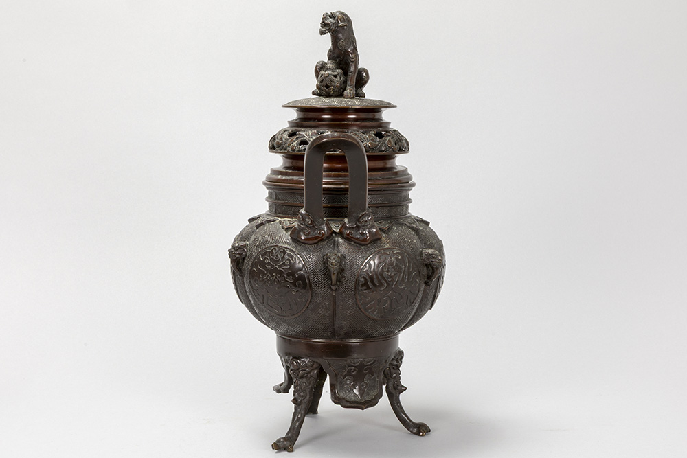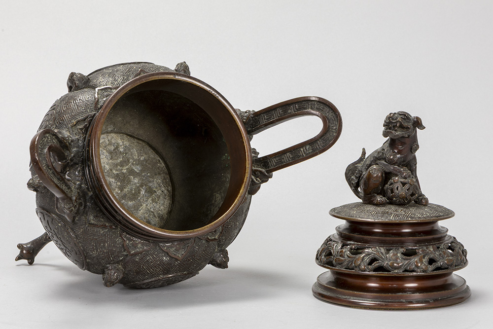 antique Oriental bronze incense burner with its lid with temple lion and with elephant heads