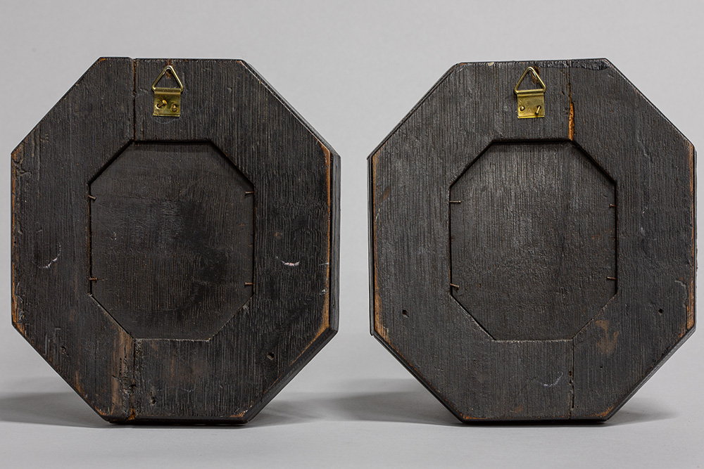 Pendant zeventiende eeuwse Europese, allicht Antwerpse, bas-reliëfs in ivoor met de barokke voorstellingen van vrouwen- en mansbuste in profiel – telkens bevestigd op een kader in gekloven hout, aan de voorzijde bekleed met schildpad, fijne filets in ivoor en dubbel geëboniseerd lijstwerk – telkens 18 x 16,5