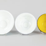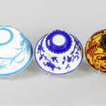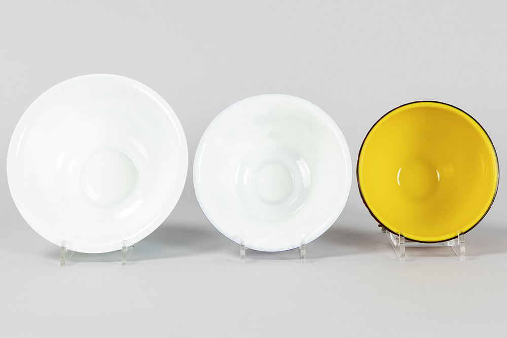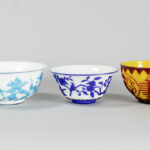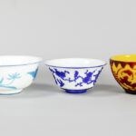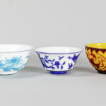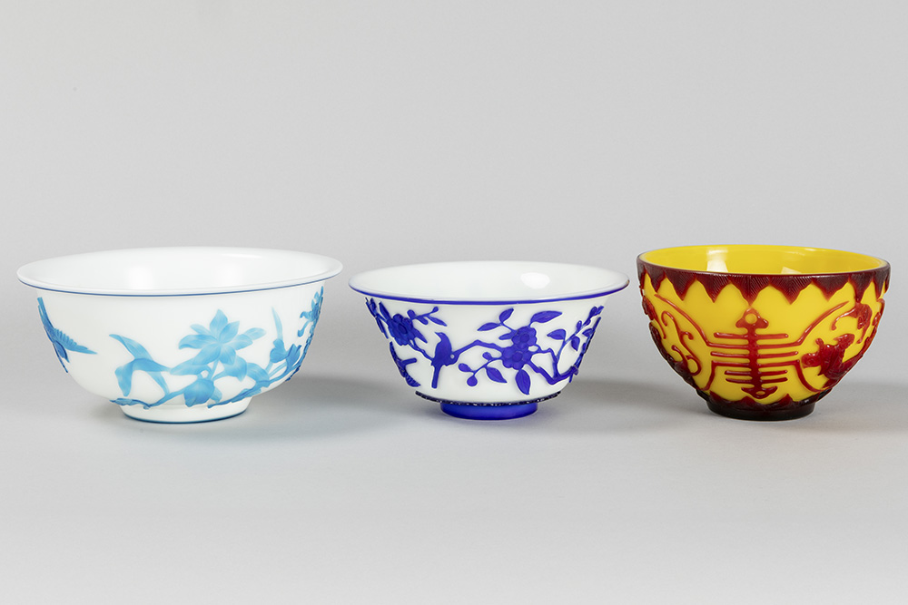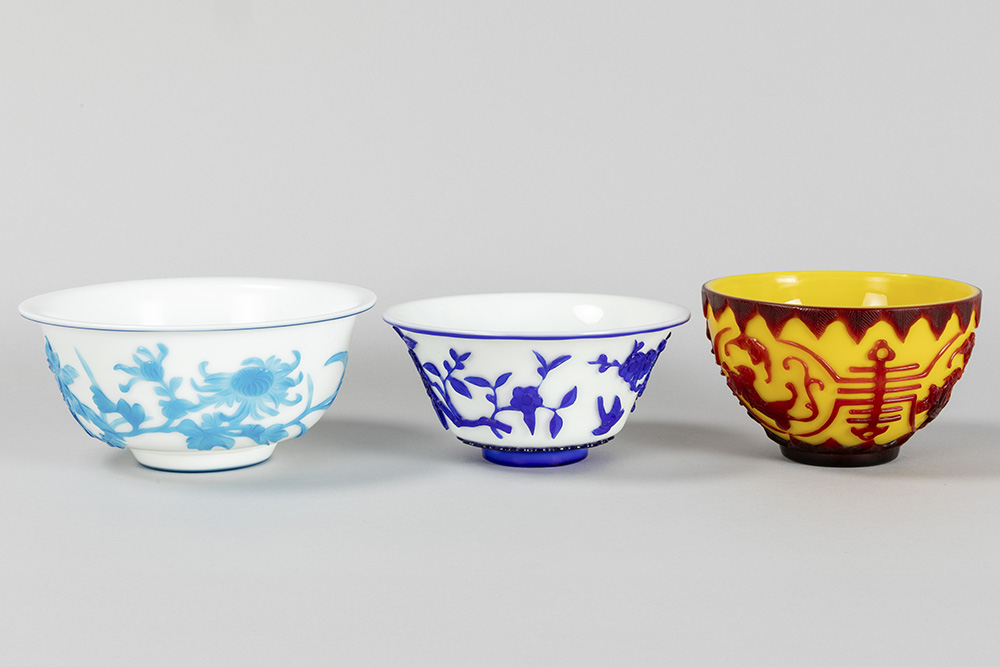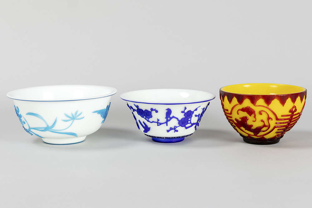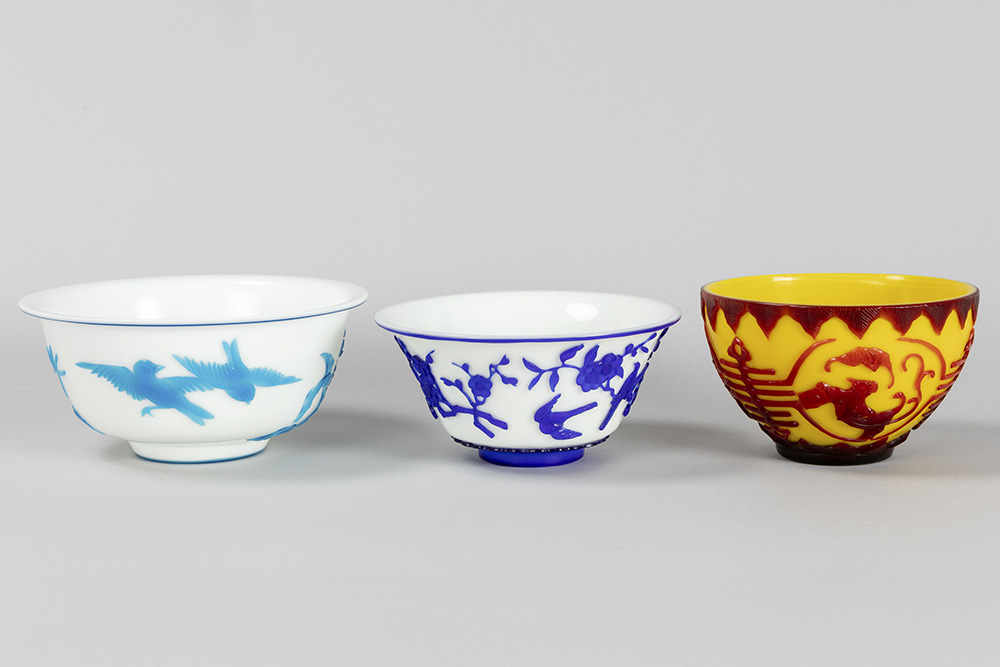 PEKING GLAS – 19°/20° EEUW lot van drie bowls waarvan twee met een blauwgekleurd decor op witte fond en één in geel en rood – diameters van 15,5 tot 20 cm