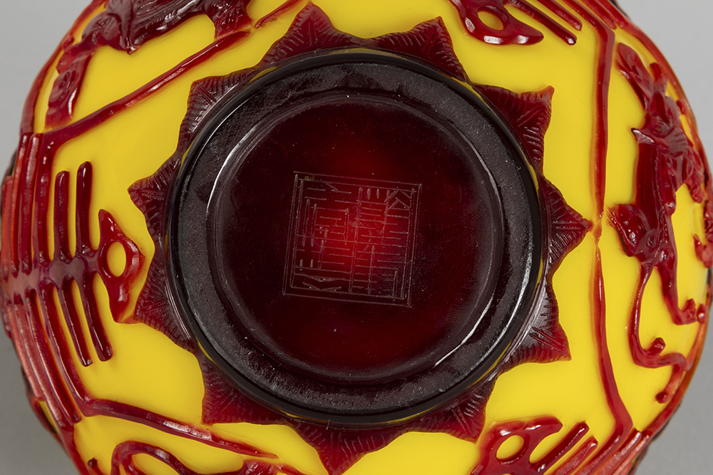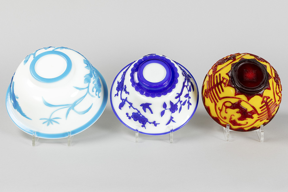 three 19th/20th Cent. Peking/Bejing glass bowls (two blue on white and one in red and yellow)