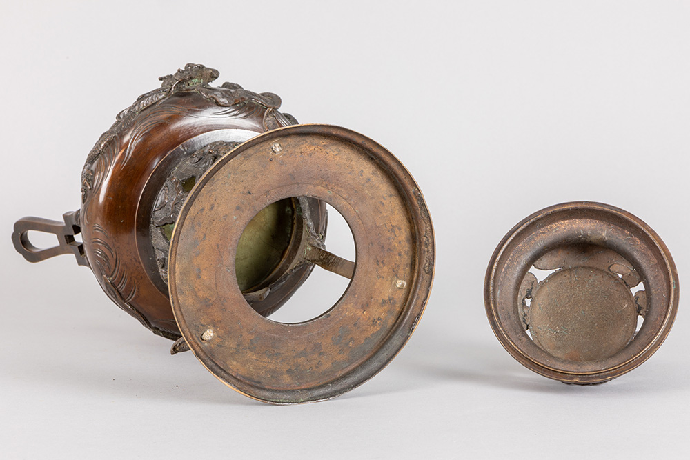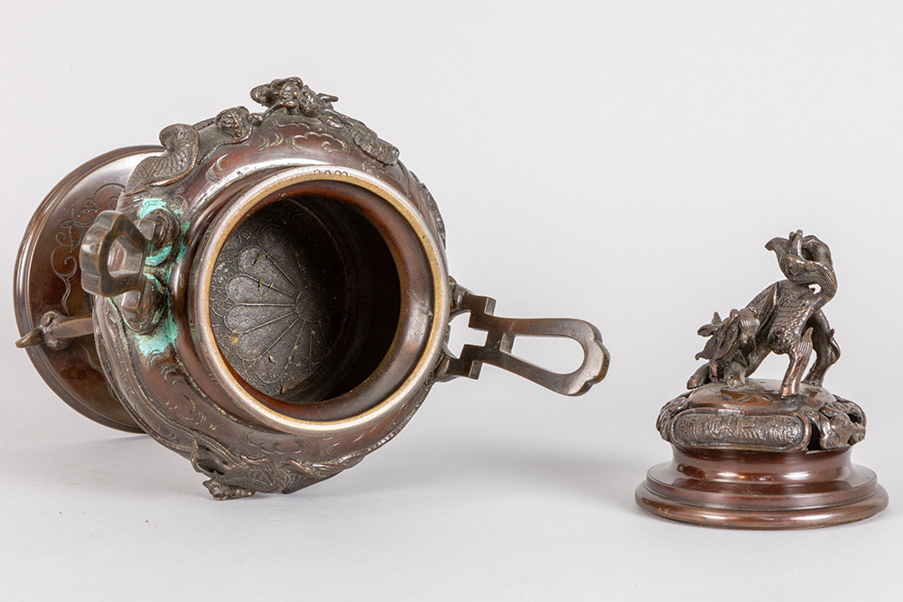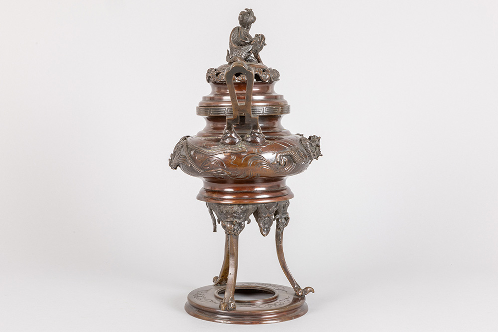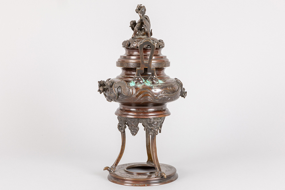 antique Oriental incense burner in bronze with dragon on lid and dragon decoration on corpus