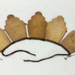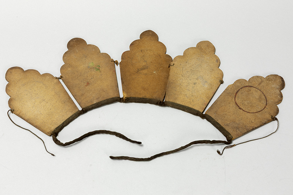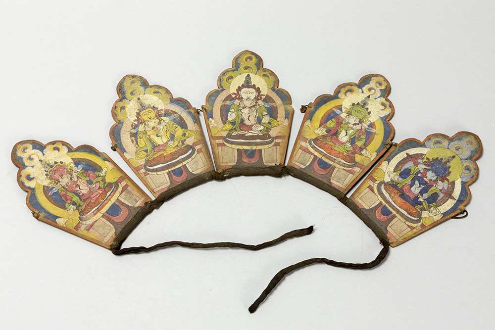 TIBET – 20° EEUW ceremonieel tantrisch-boeddhistisch “kroontje” gebruikt door lama’s tijdens rituelen, met de typische vijf door linten verbonden paneeltjes, telkens beschilderd met een boddhisatva met gezellin – hoogte (van ieder paneeltje) : 16,5 cm