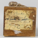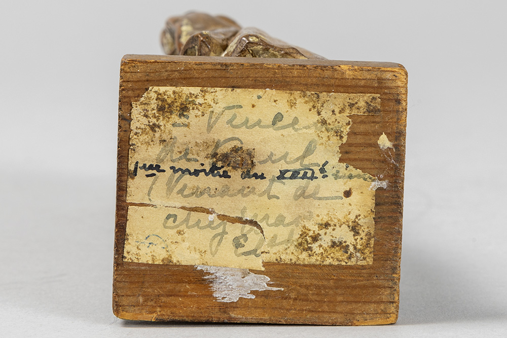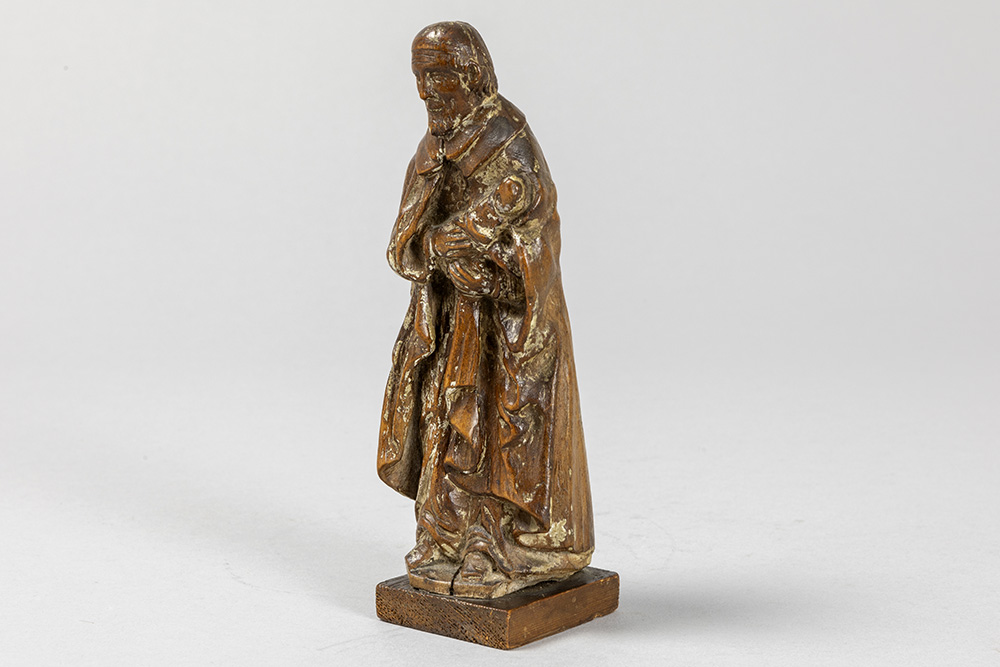 Zestiende eeuwse Europese houtsculptuur uit de gotische periode met restanten van de originele polychromie : “Man met baby” – hoogte : 15 cm prov : ex-collectie van de symbolistische schrijver Max Elskamp (1862 – 1931)