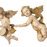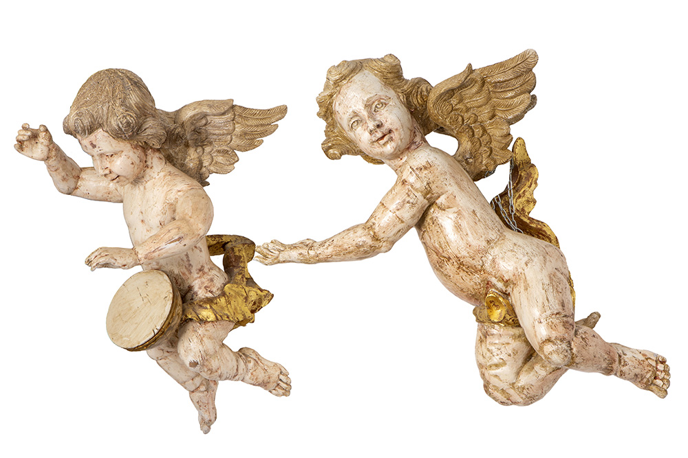 pair of 17th Cent. Italian baroque sculptures in painted wood with cute themes and nice details : “Singing cupid” and “Musician angel”