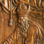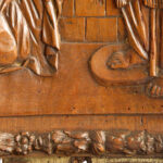 ITALIË – 16/17° EEUW Renaissance-bas reliëf in fruithout met zeer gedetailleerd gesculpteerd tafereel met heilige met mijter bij twee vrouwen – met sierlijke zeer fijne guirlandes – 33 x 50 – gemonteerd op metalen voet
