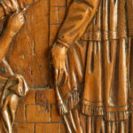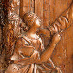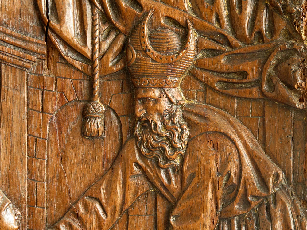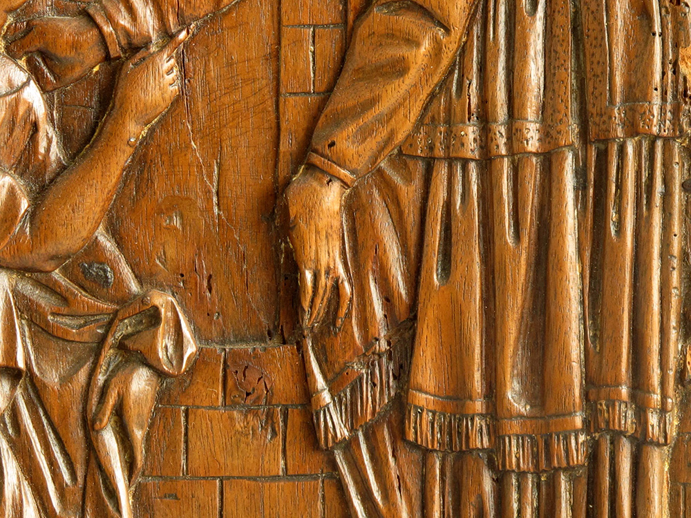 16/17th cent. Italian bas relief in fruitwood with a finely sculpted scene with two women and a Saint