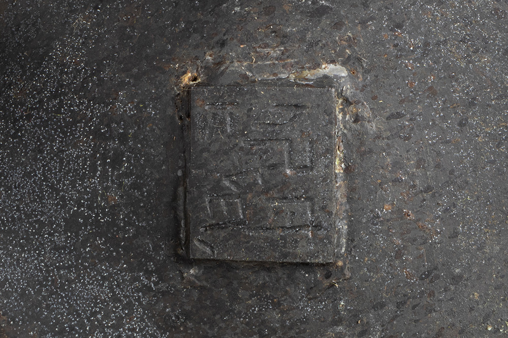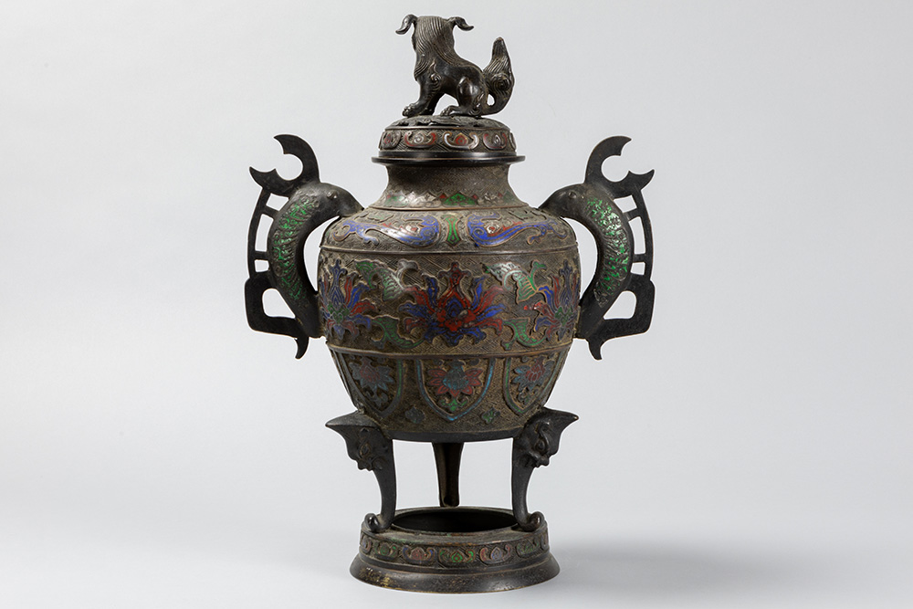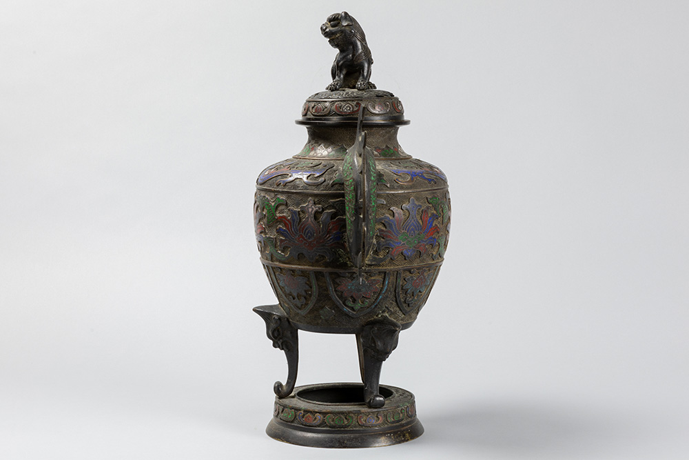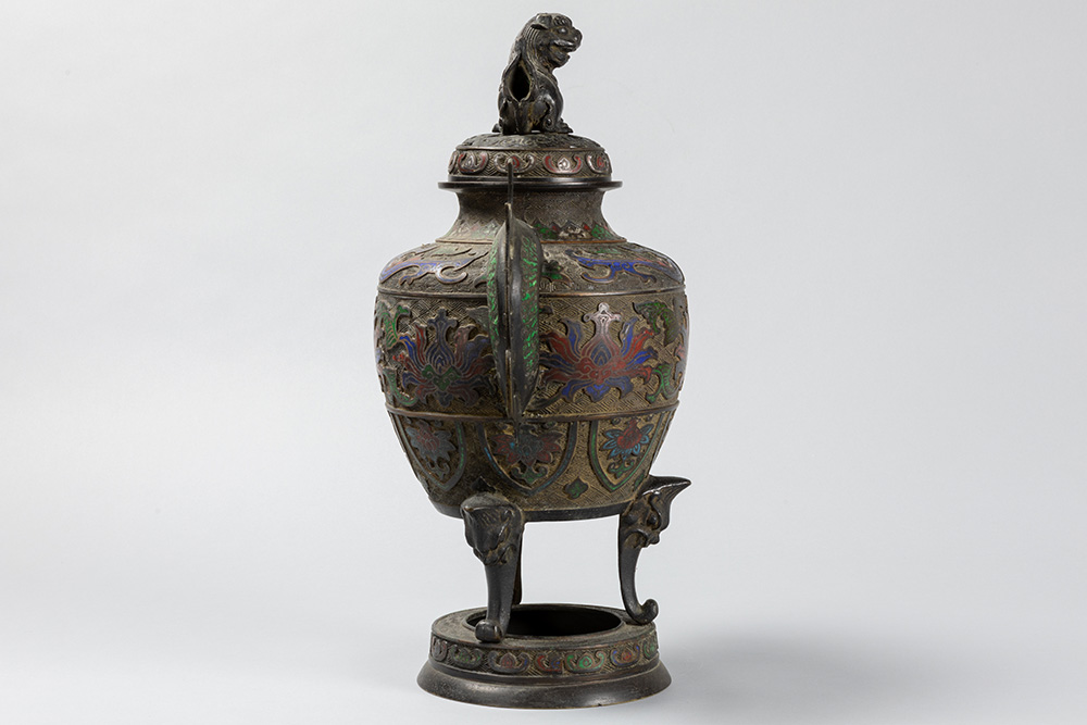 antique Chinese cloisonné vase with three legs on a round base and with its lid with temple lion