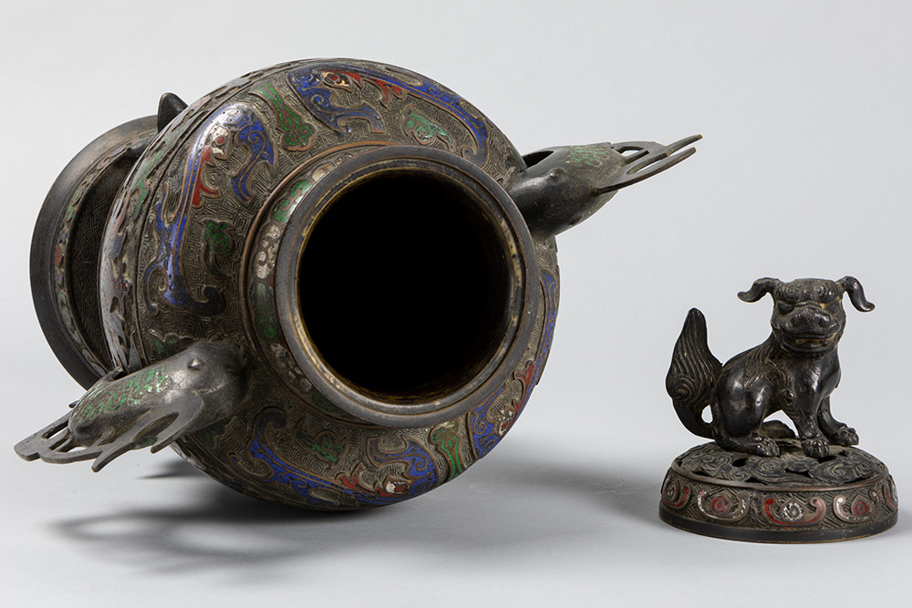 Antieke Chinese vaas in cloisonné met drie pootjes op ronde basis en met deksel bekroond met een fô-hondje – hoogte : 43,5 cm