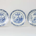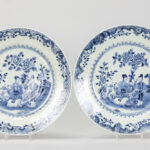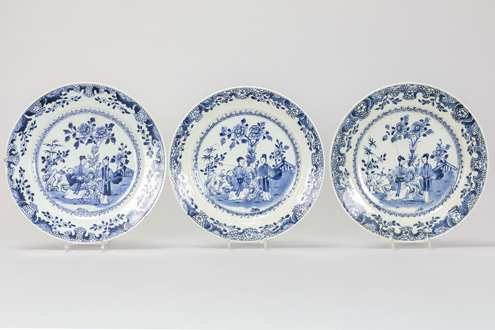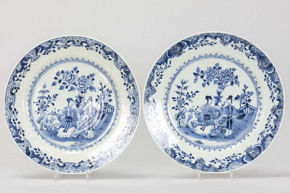 series of five 18th Cent. Chinese dishes in porcelain with a blue-white decor with family in garden